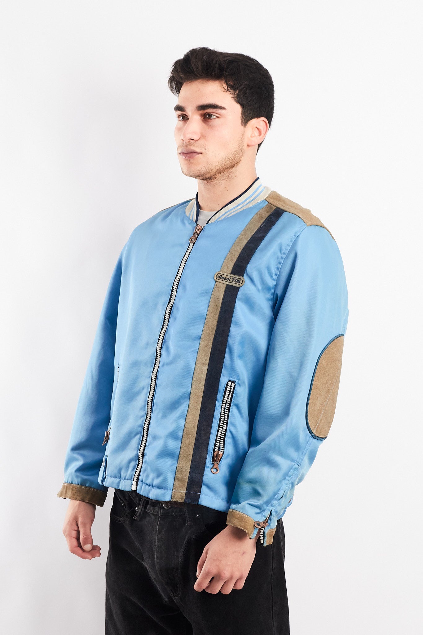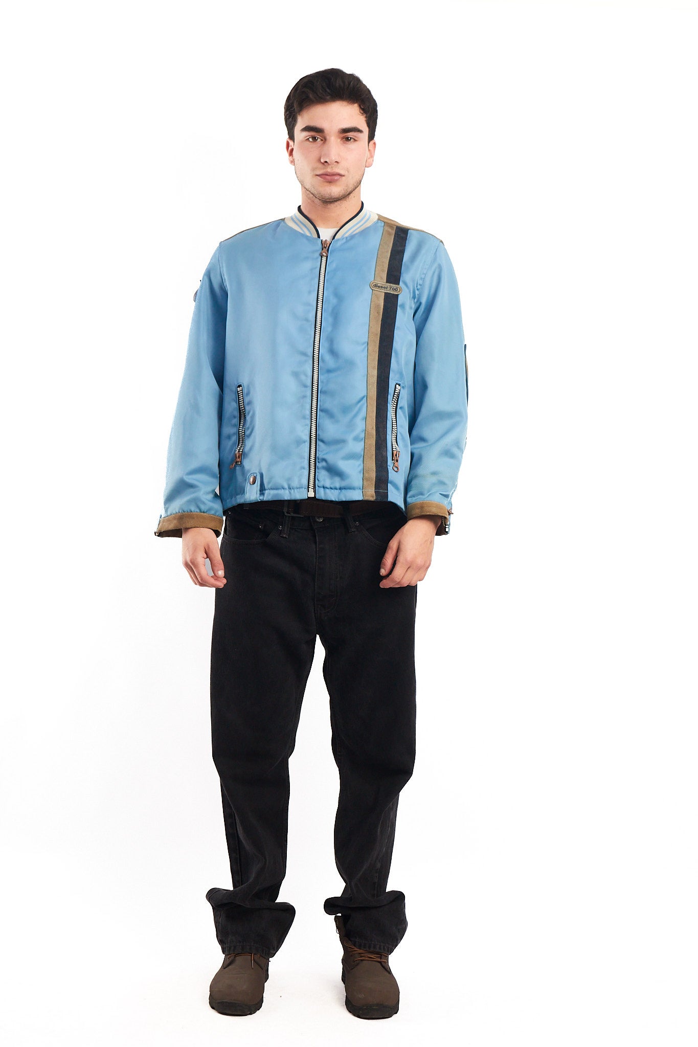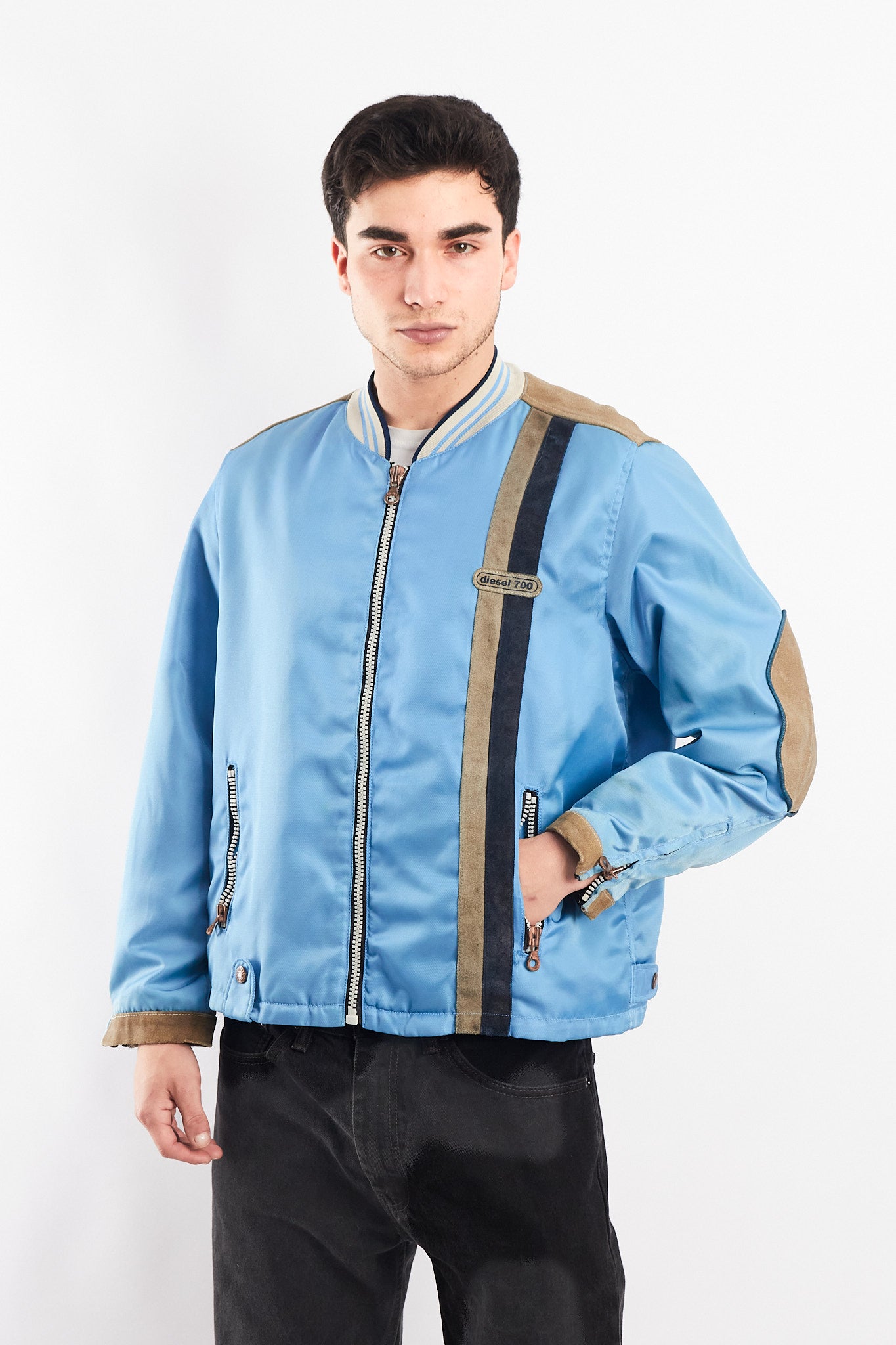 Hecho de 100% poliester con aplicaciones de cuero gamuzado . Cuenta con bordado de cuero en el pecho. Tiene un cierre de cobre con grabado Diesel. Tiene 2 bolsillos con cierre a los lados y cierre en las mangas. Forro interno platinado satinado.