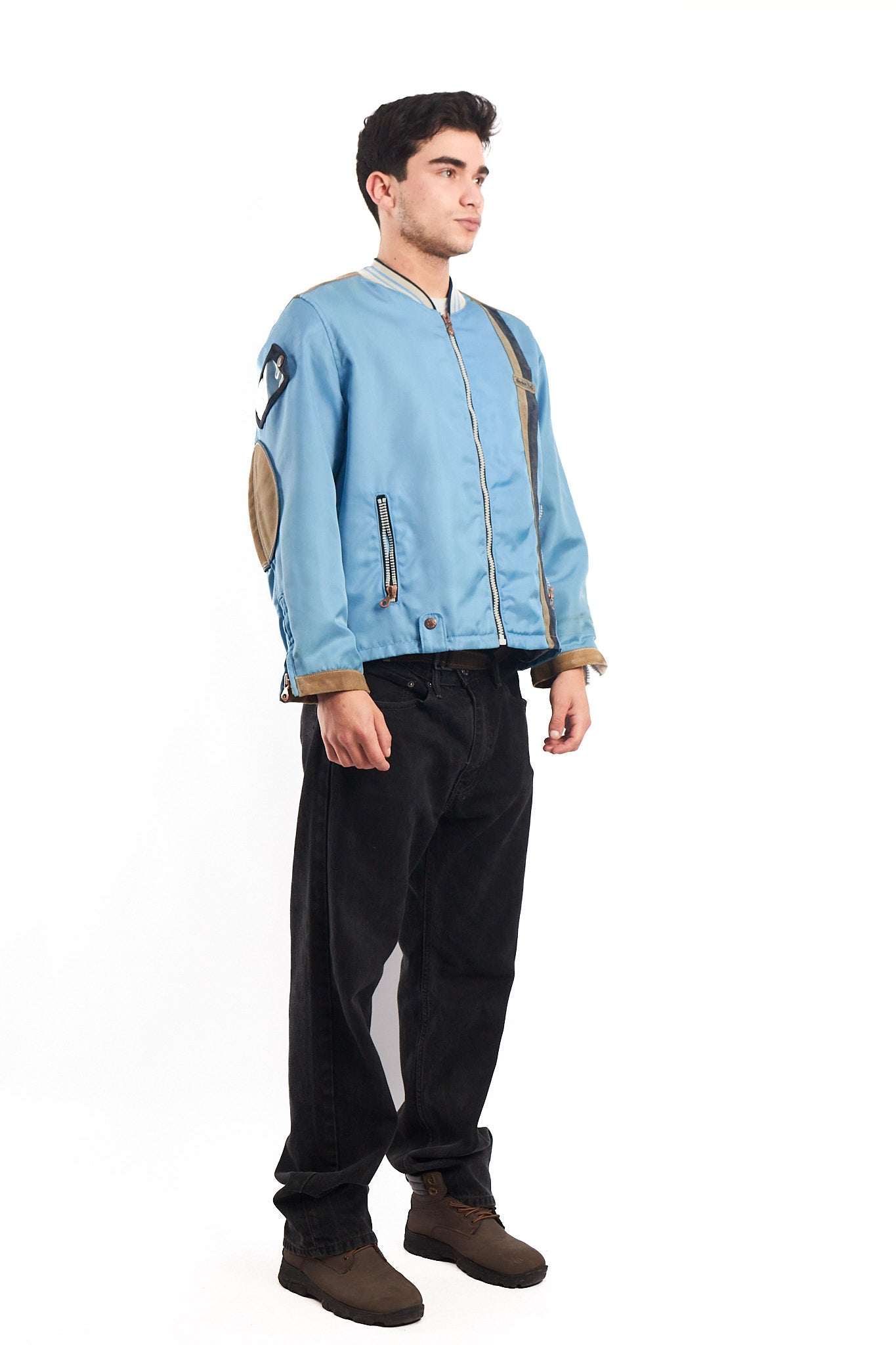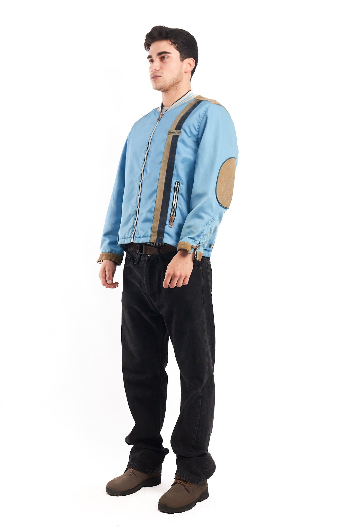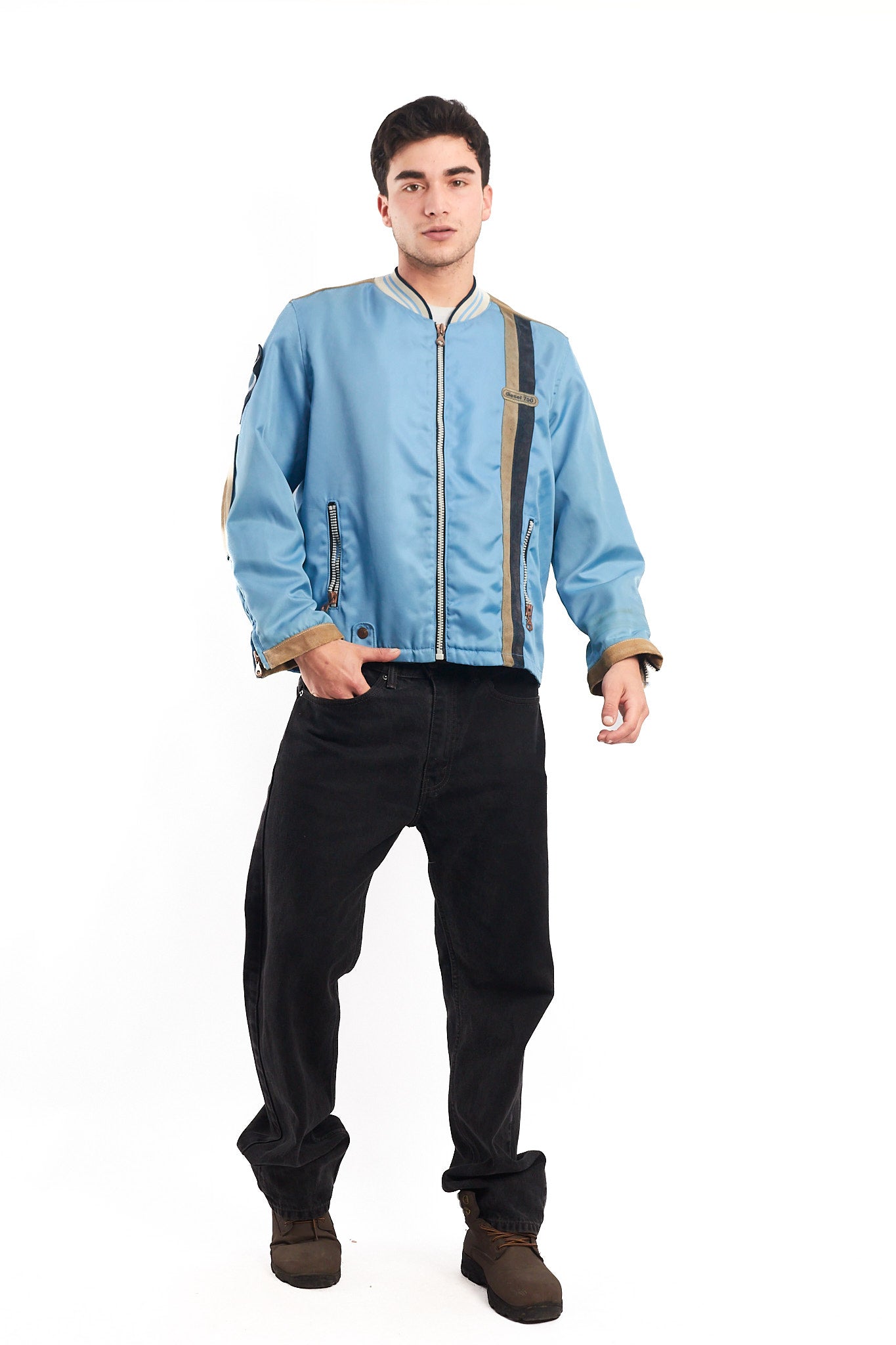Hecho de 100% poliester con aplicaciones de cuero gamuzado . Cuenta con bordado de cuero en el pecho. Tiene un cierre de cobre con grabado Diesel. Tiene 2 bolsillos con cierre a los lados y cierre en las mangas. Forro interno platinado satinado.