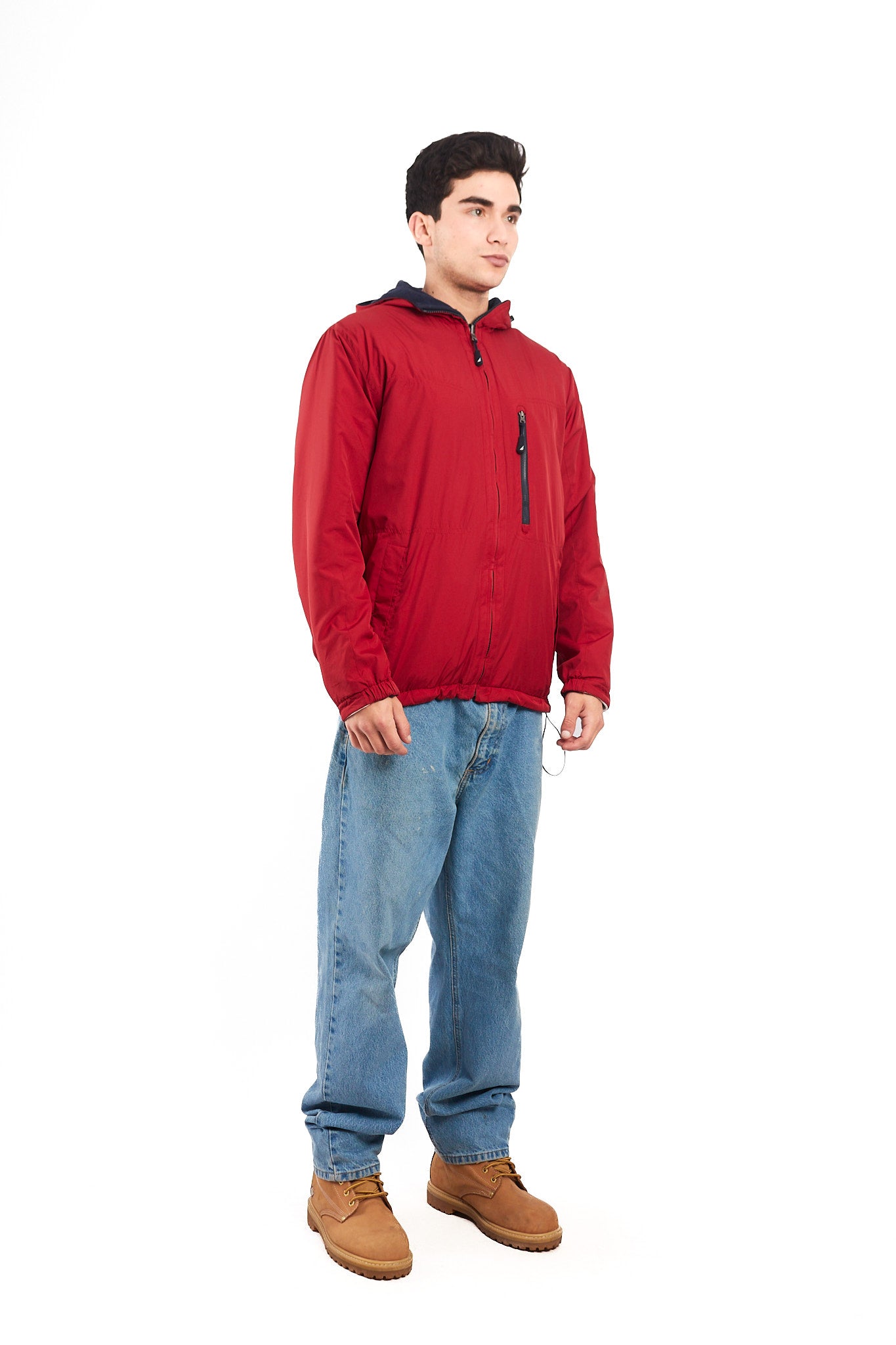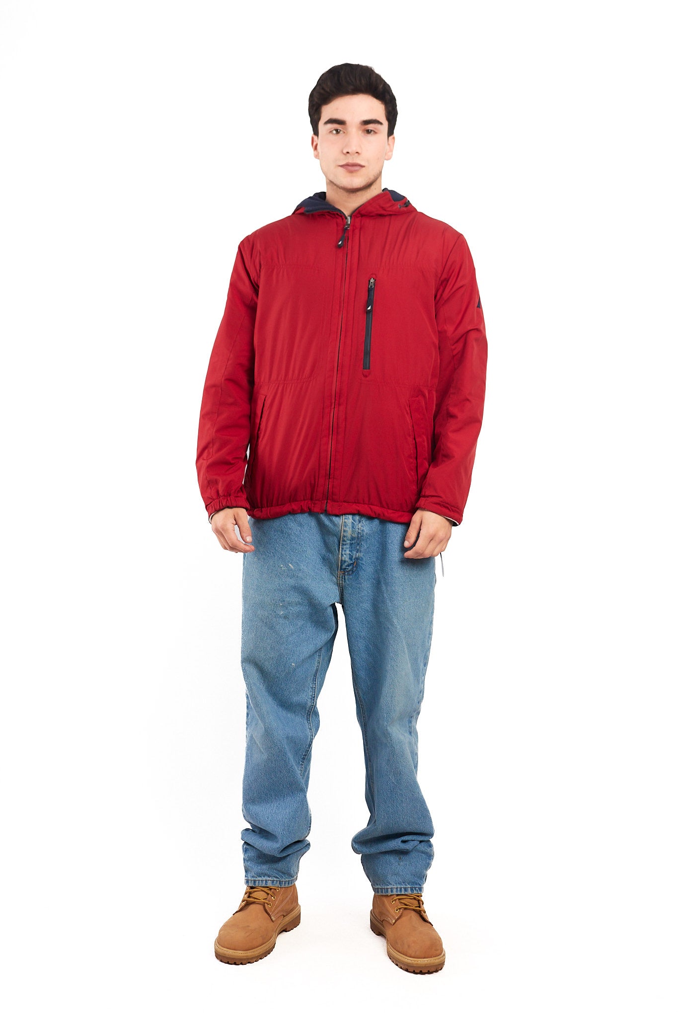 Hecho de 100% polyester. El lado principal es tipo cortaviento color rojo con bordado Nautica en el brazo y espalda. Cuenta con 3 bolsillos con cierre.