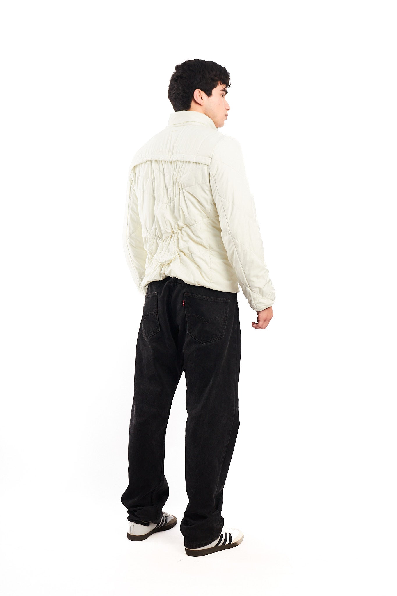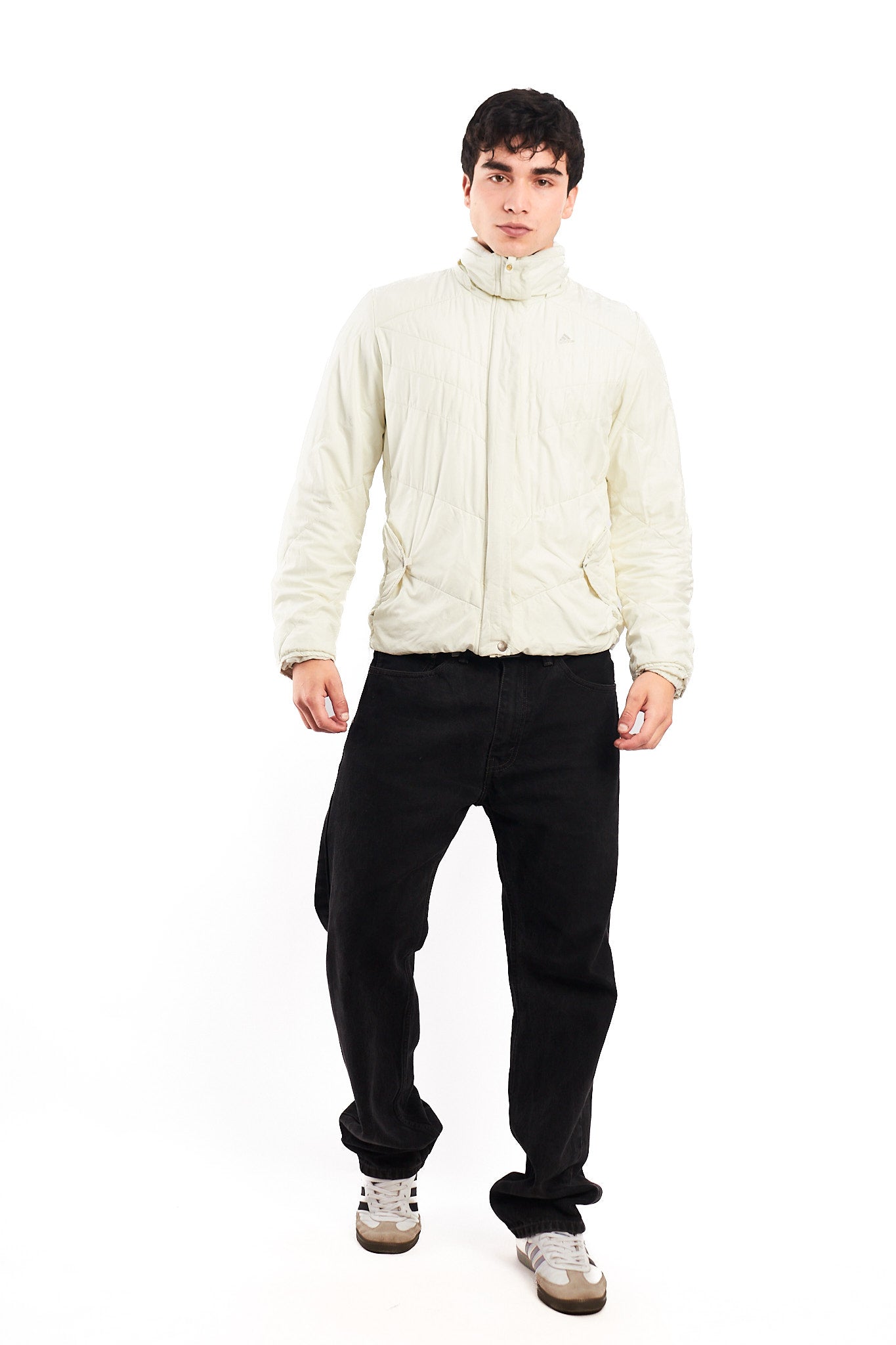 Hecho de 100% polyester con plumas de pato. Color crema con bordado Adidas. Cuenta con 2 bolsillos externos. Cuenta forro interno blanco.