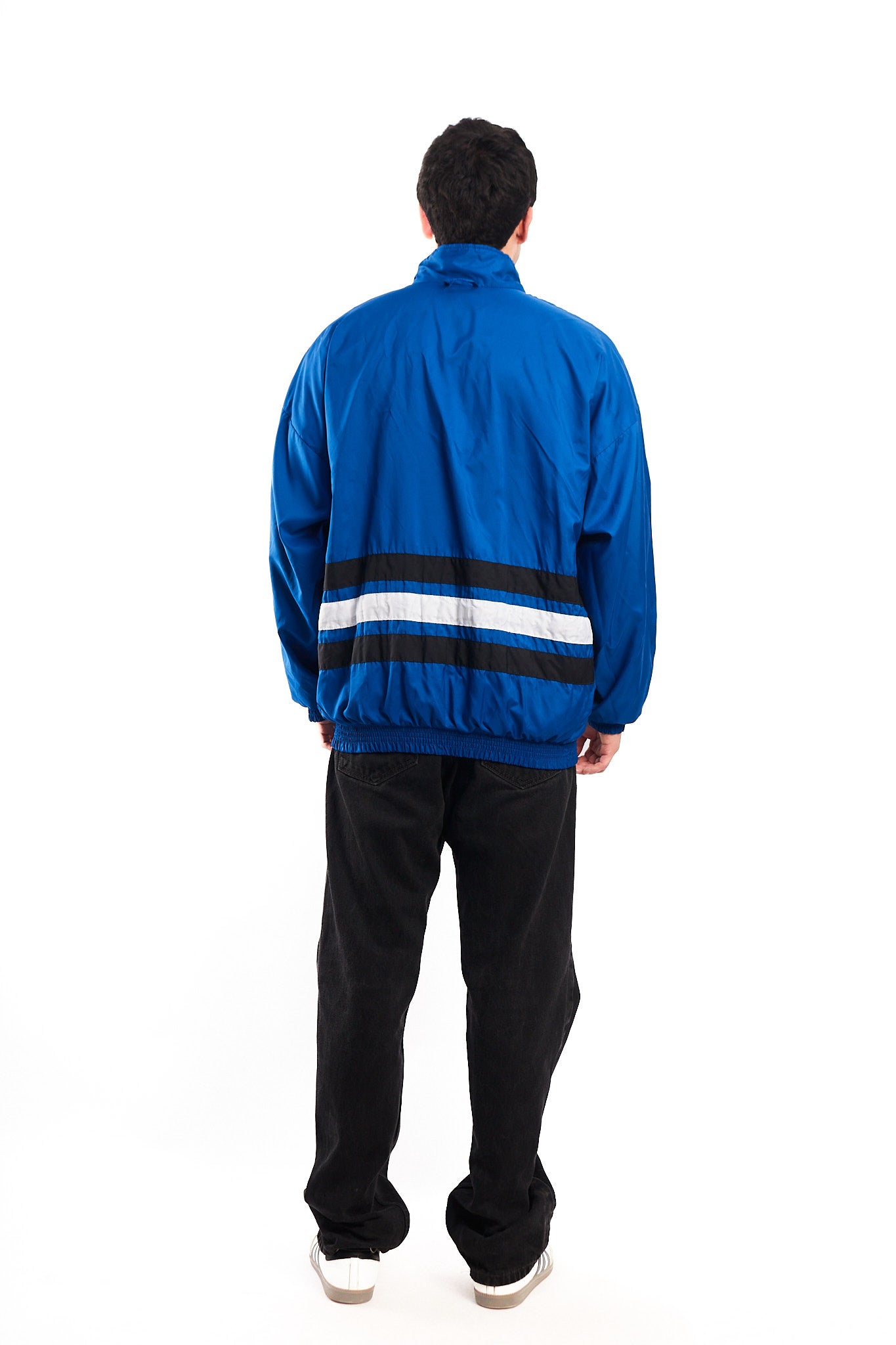 Hecho de 100% nylon. Color azul con franjas blancas y negras. Tiene un bordado Adidas en el pecho. Cuenta con 2 bolsillos a los lados. Forro interno blanco de algodón