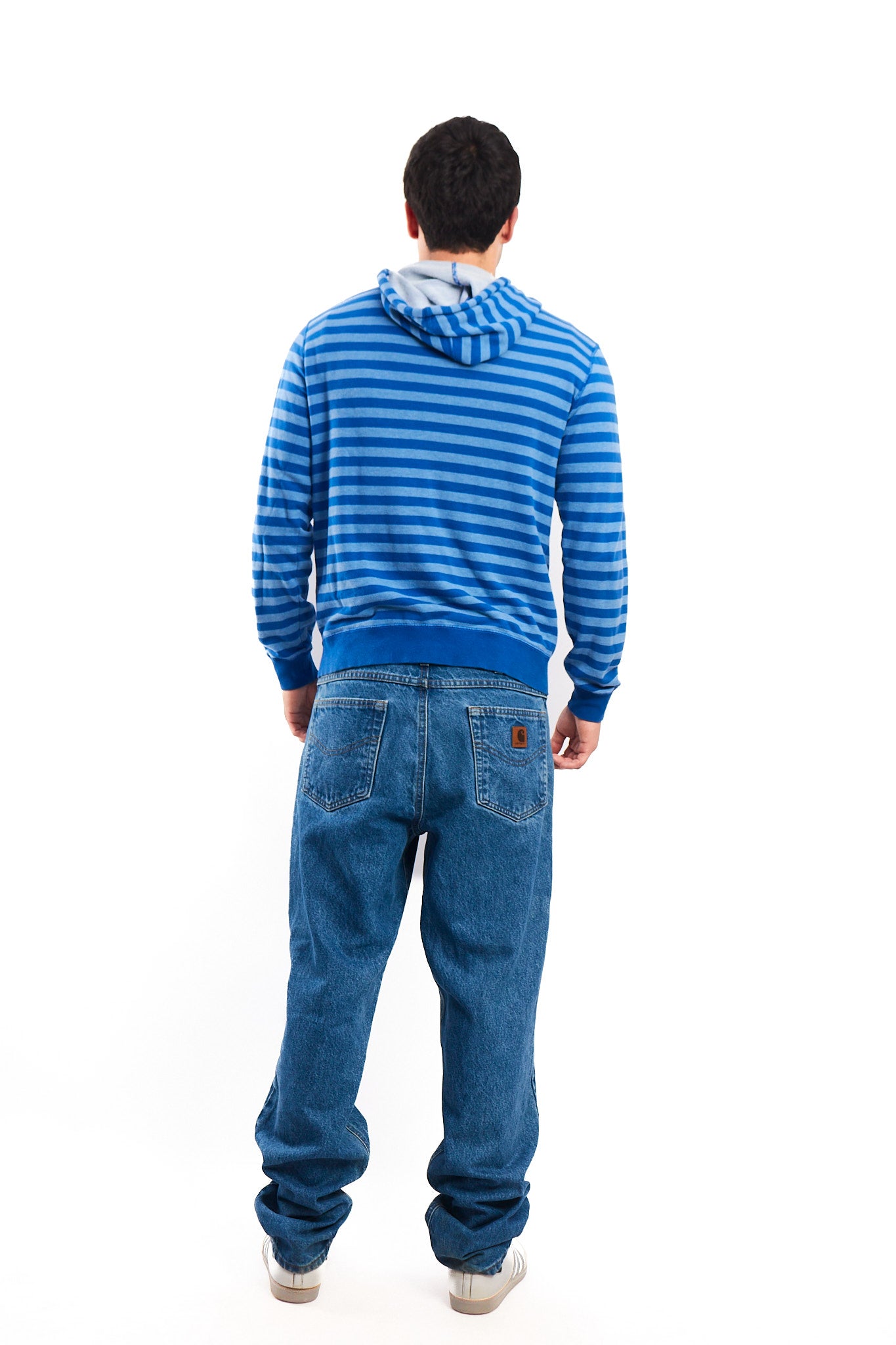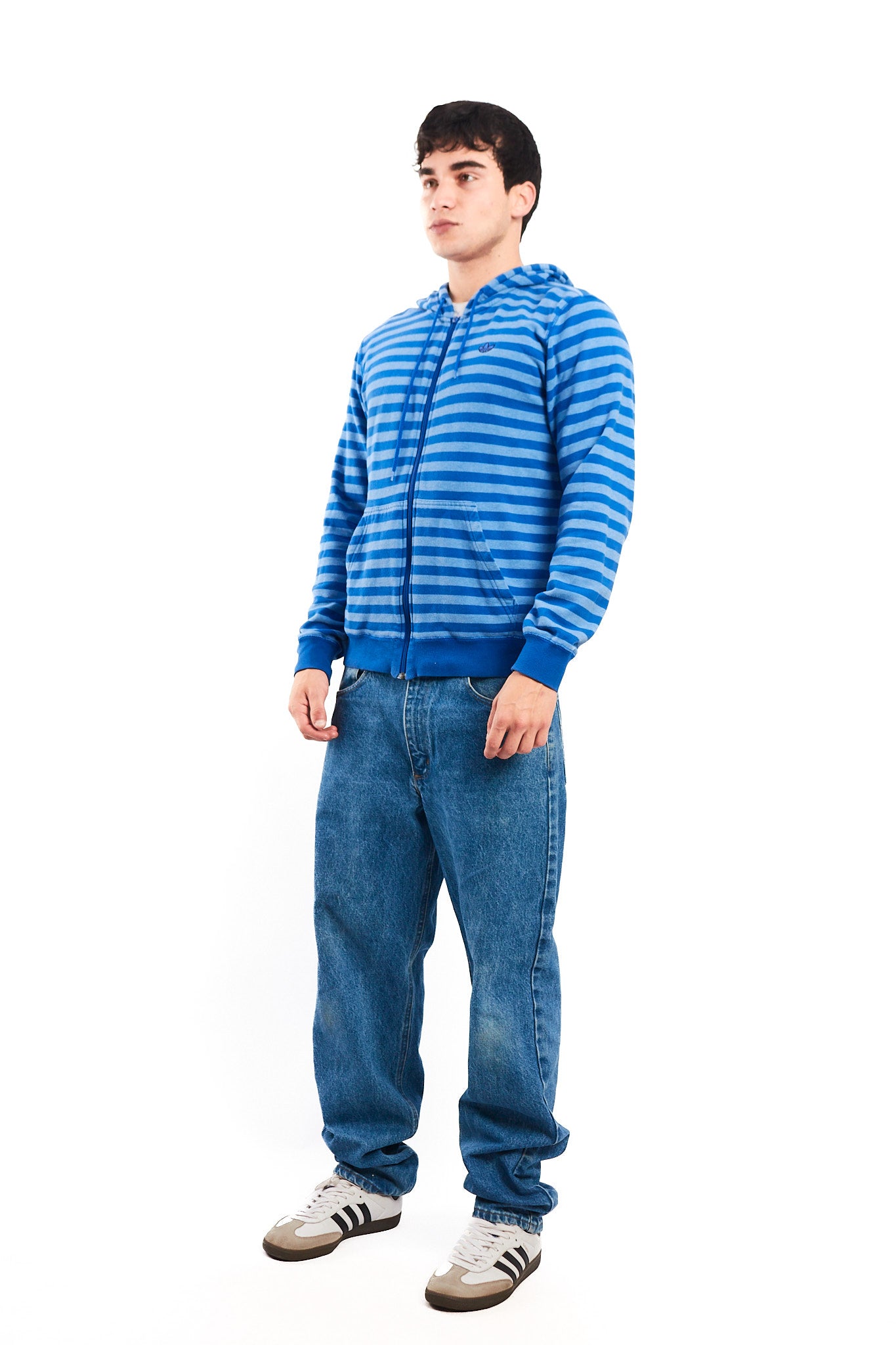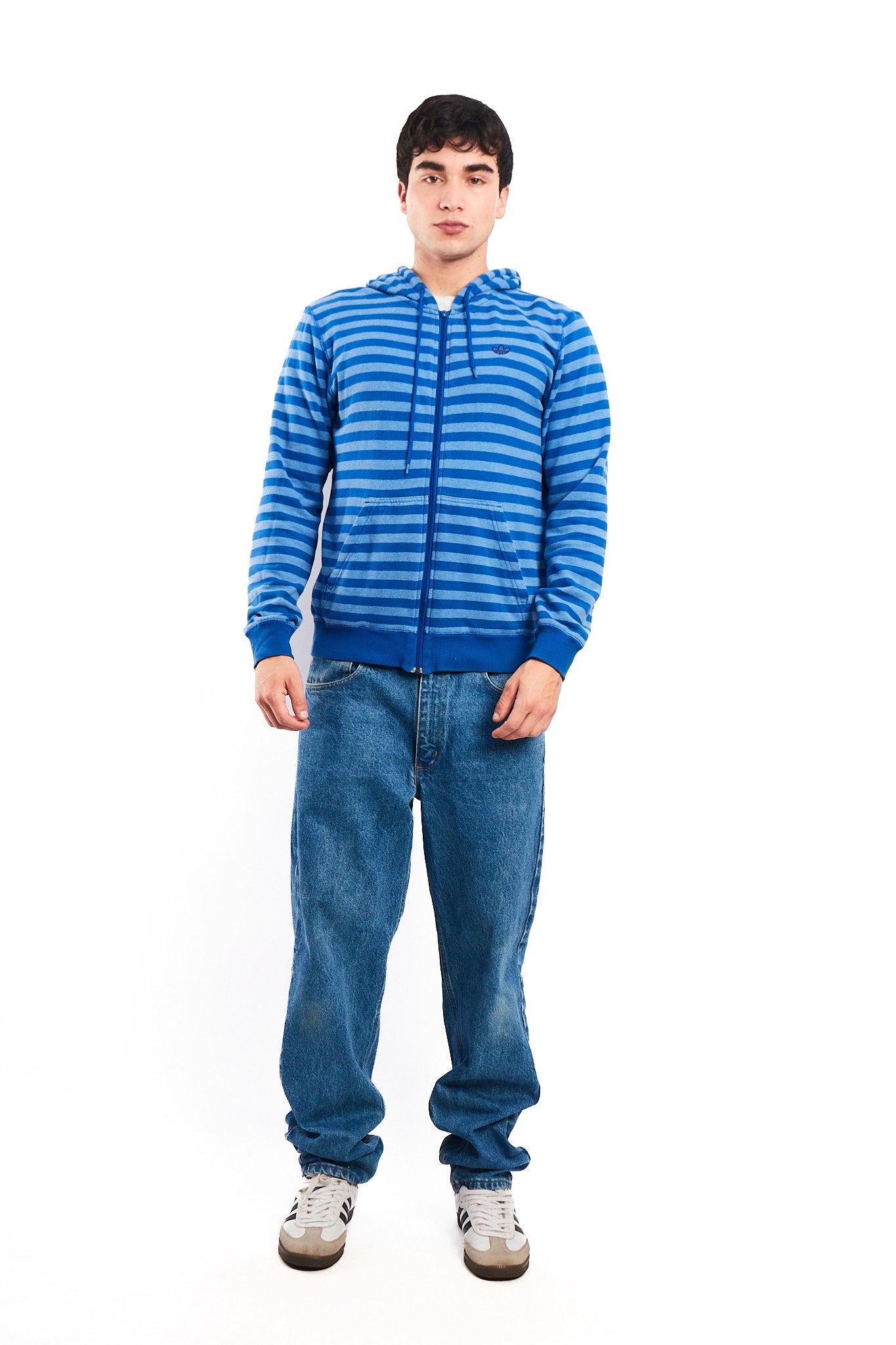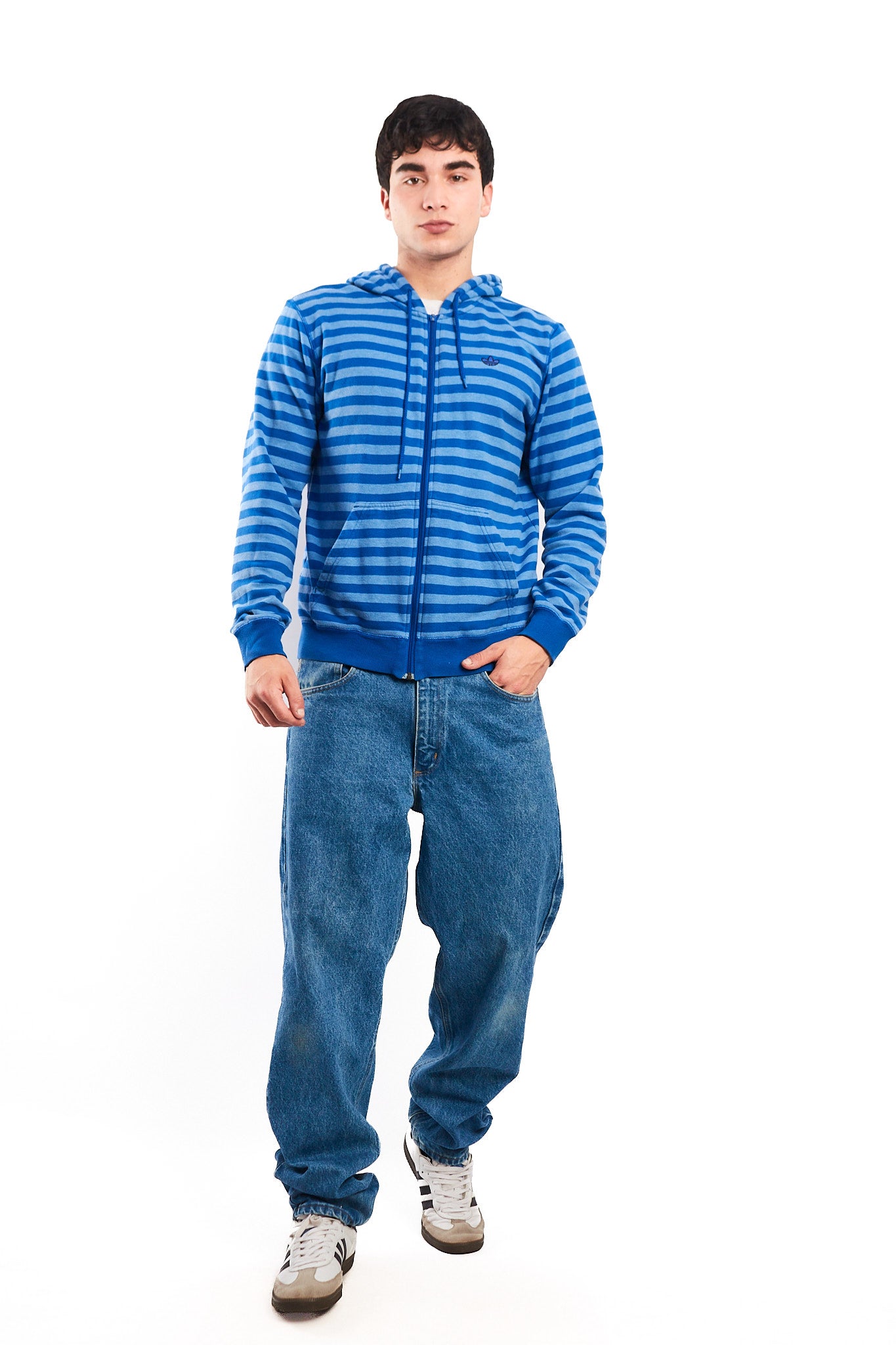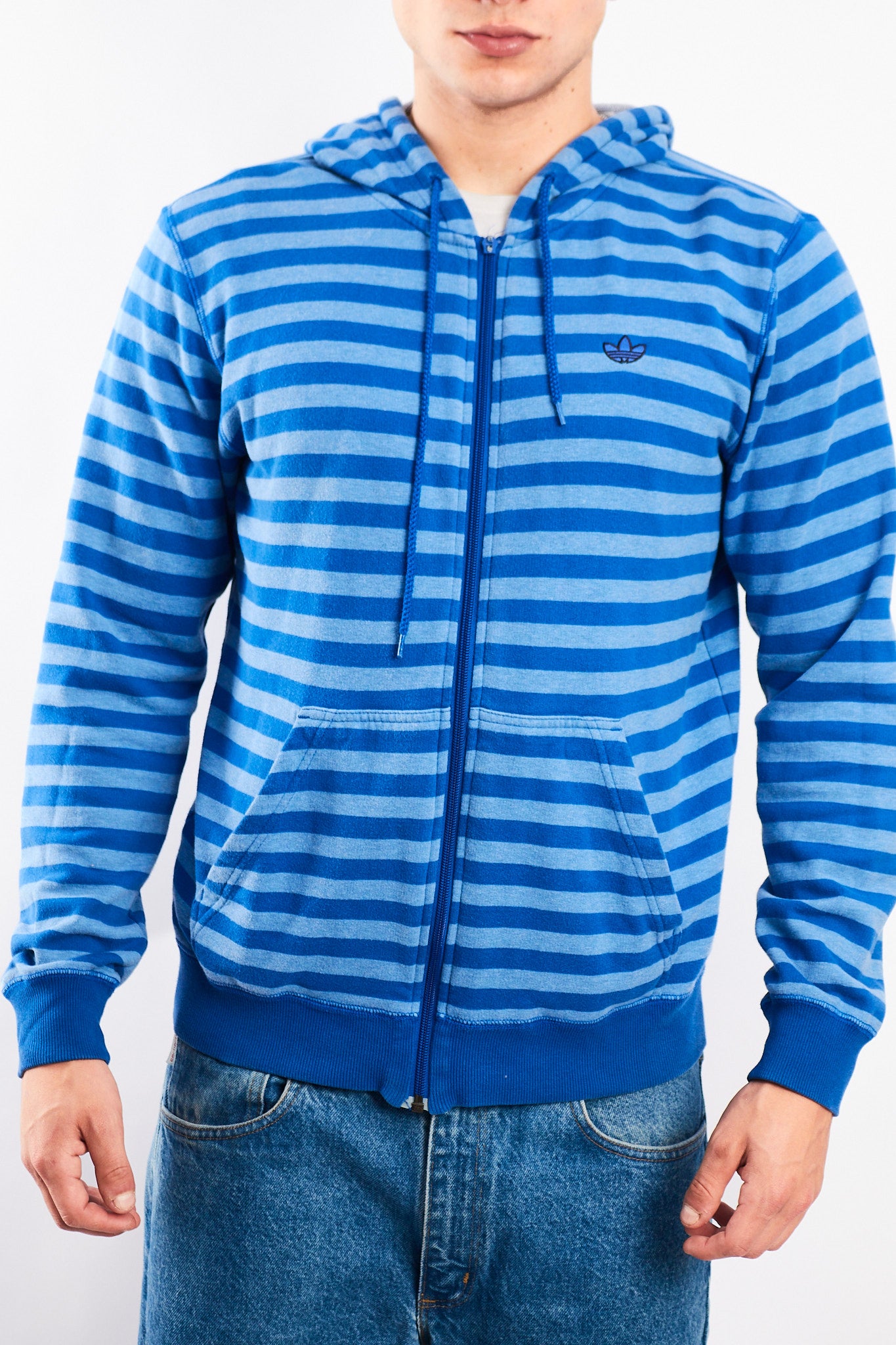 Hecho de 84% algodón y 16% polyester Color azul marino de rayas con azul claro. Tiene un bordado Adidas en el pecho. Cuenta con 2 bolsillos a los lados.