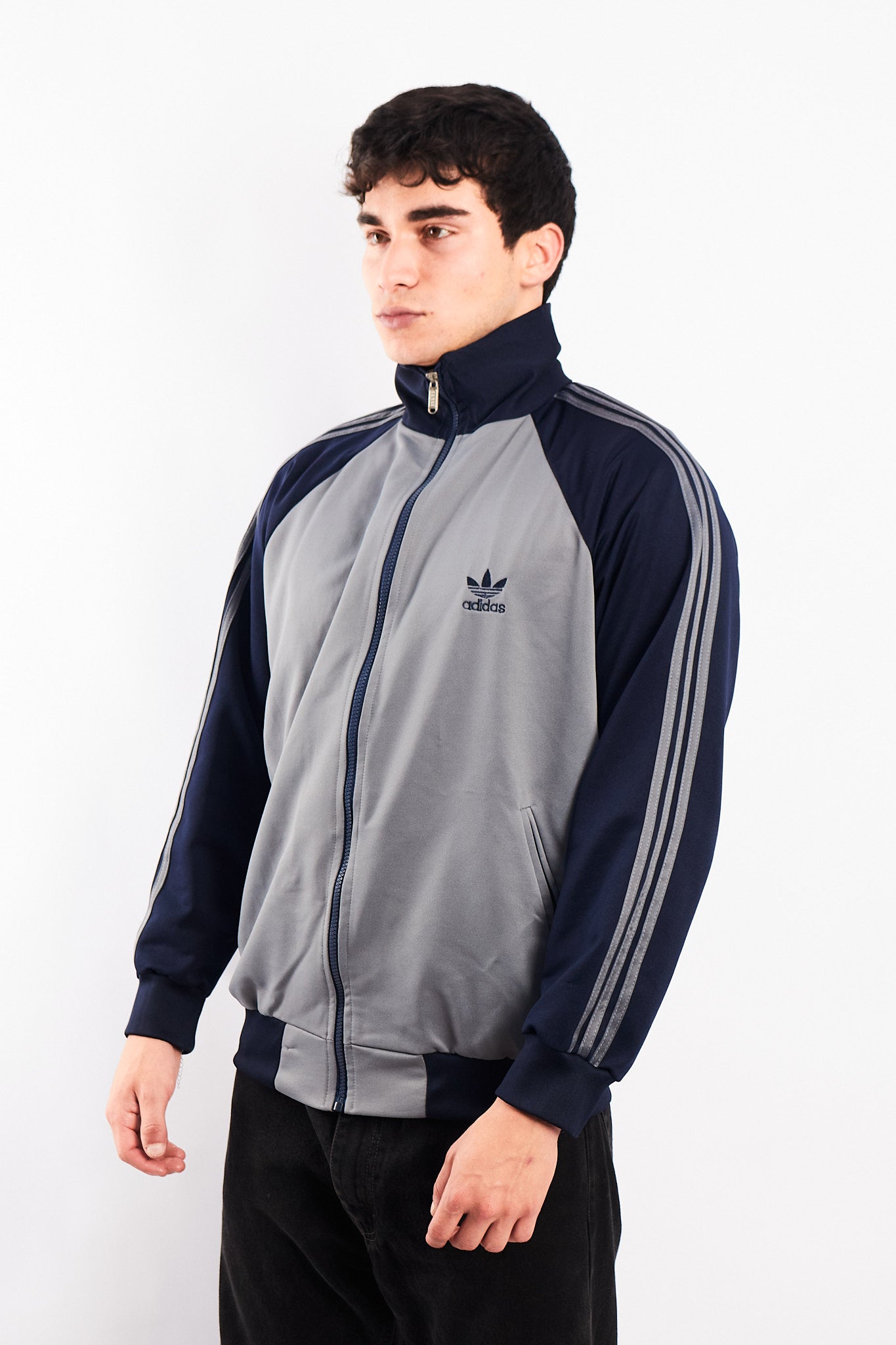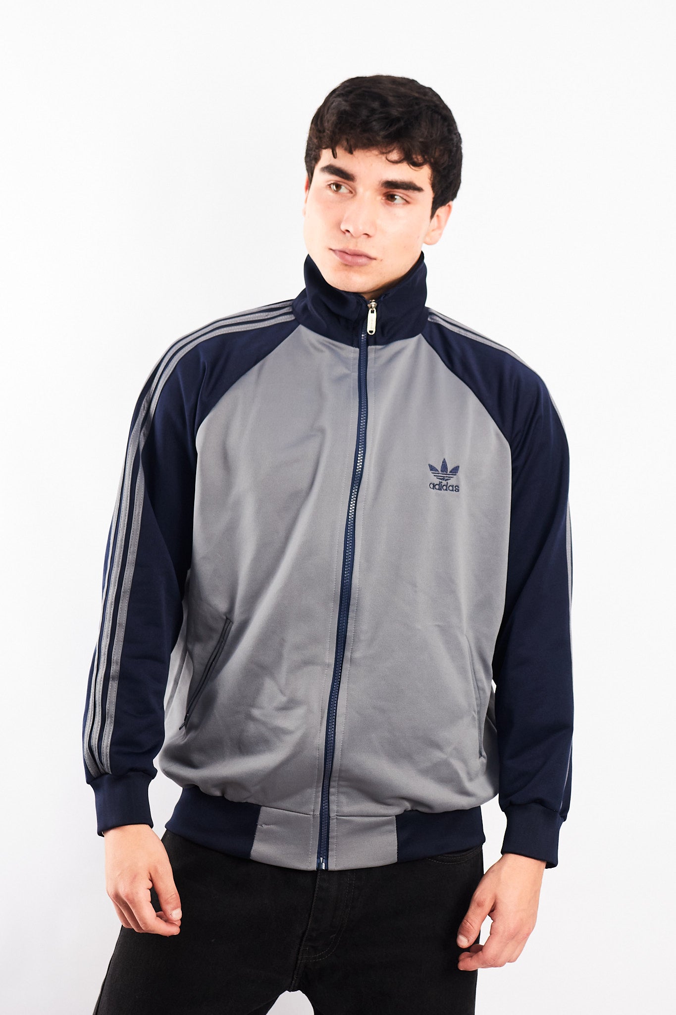Hecho de 100% polyester. Color gris con azul noche con franjas grises. Tiene un bordado Adidas en el pecho. Cierre plateado Adidas con 2 bolsillos con cierre.