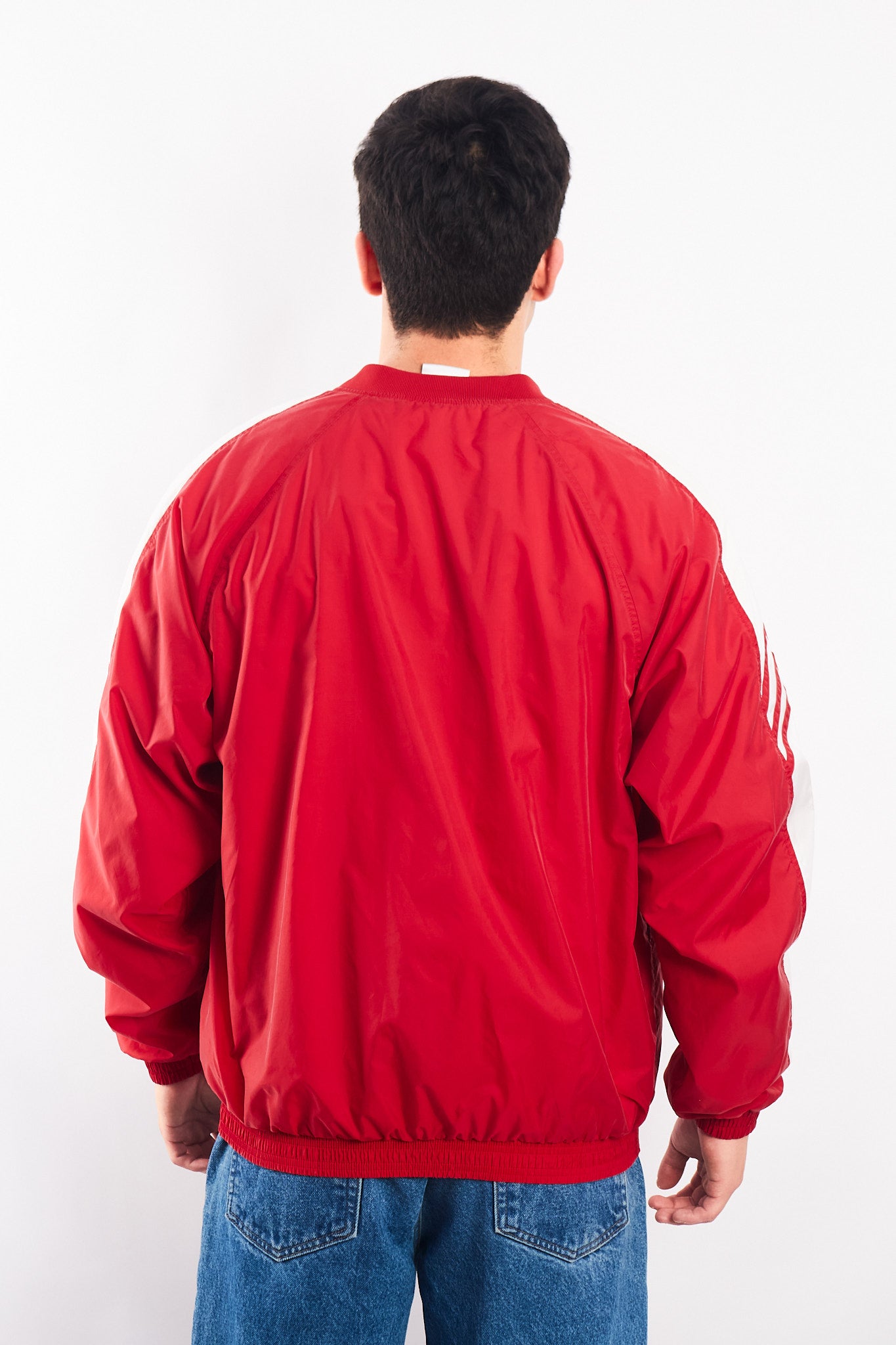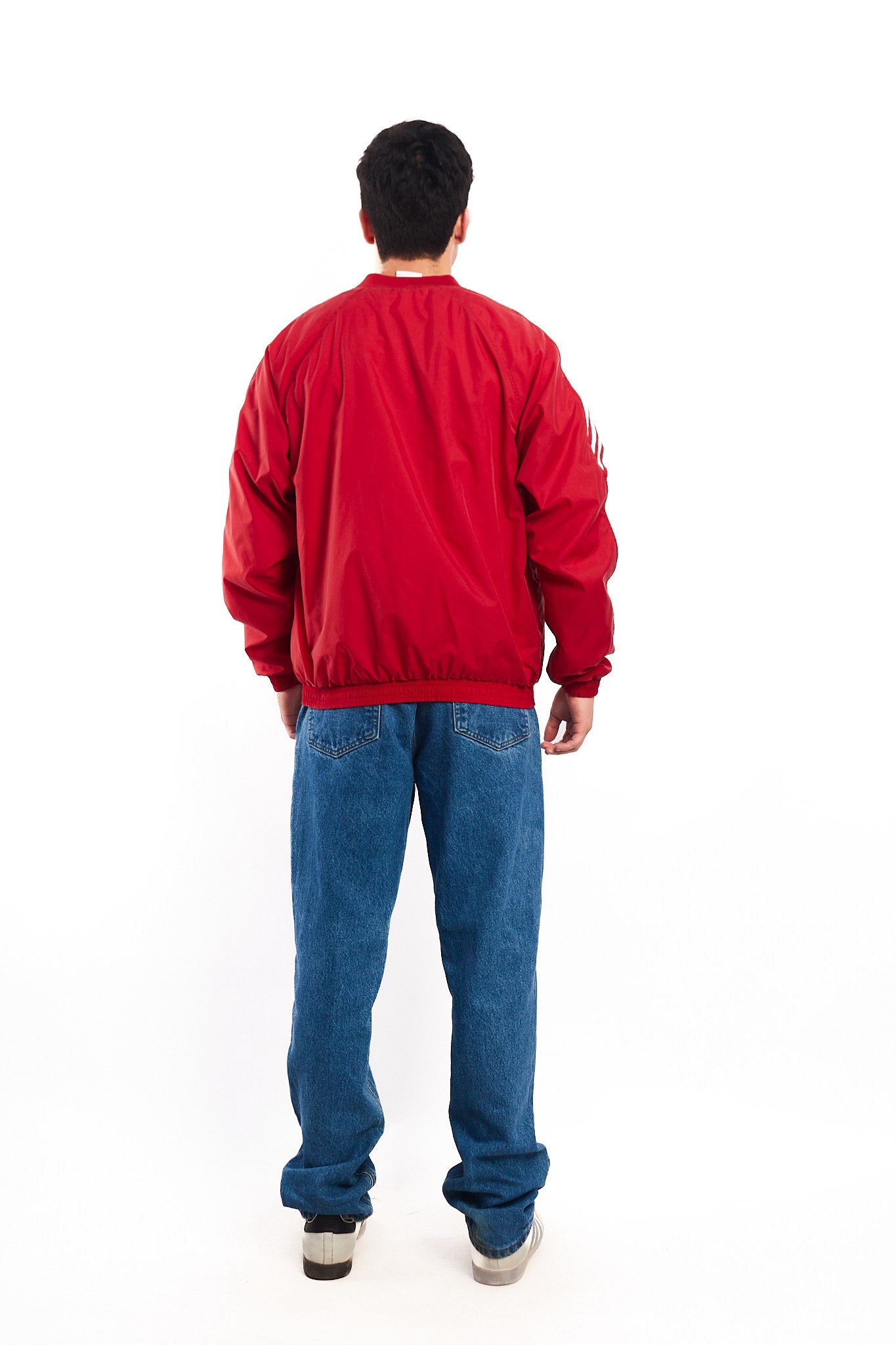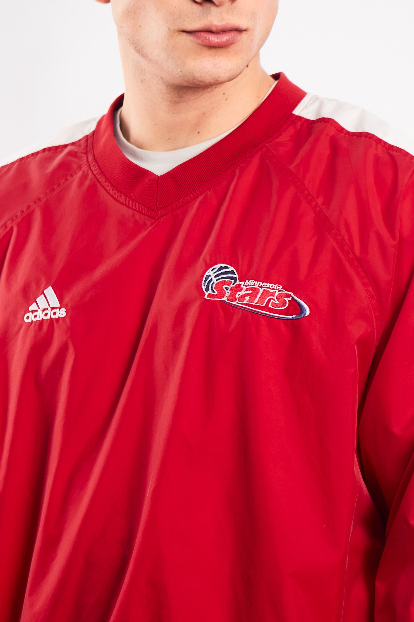 Hecho de 100% polyester. Color rojo con franjas blancas. Tiene bordado Adidas en el pecho y bordado Minnesota. Cuenta con 2 bolsillos a los lados.