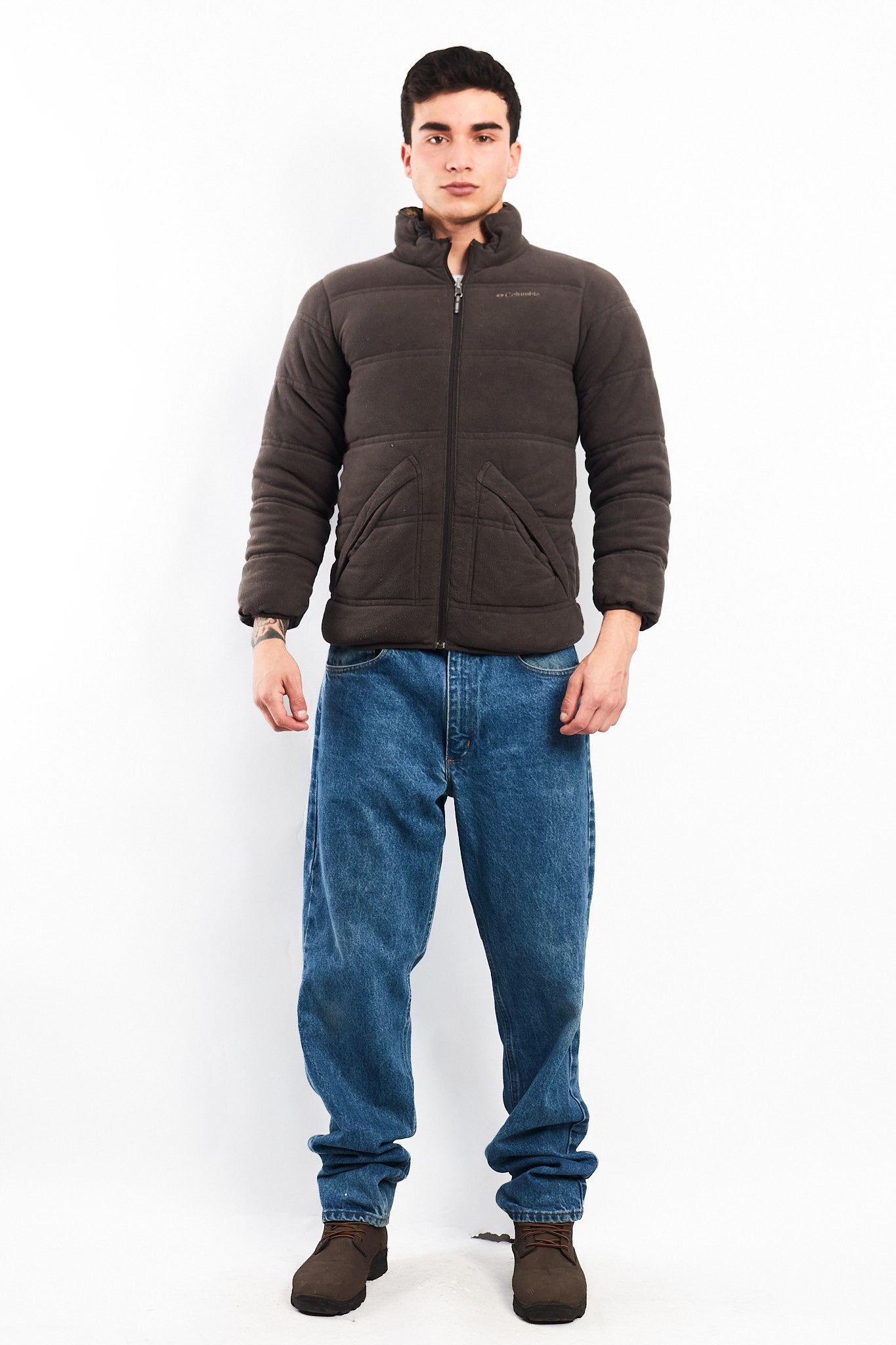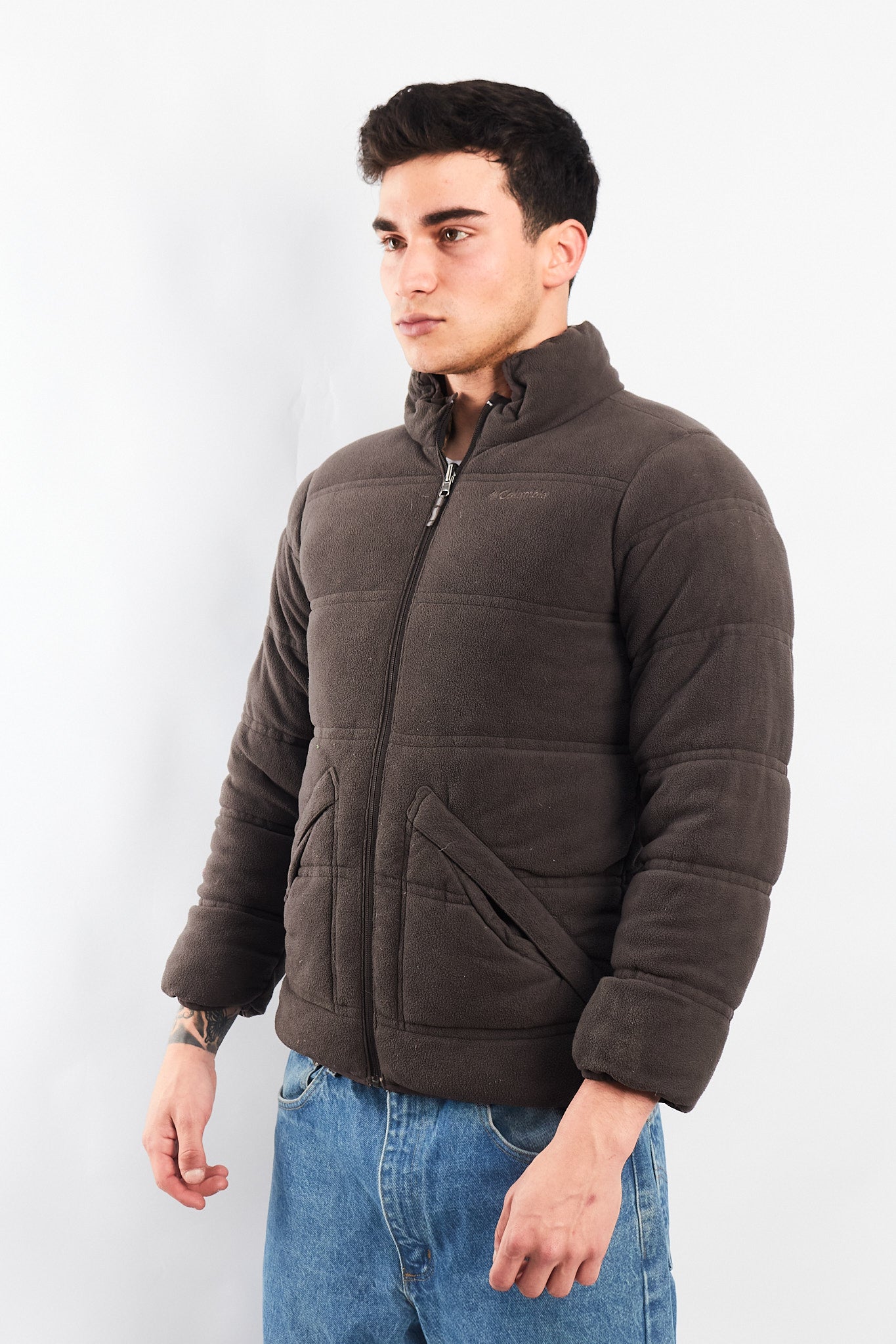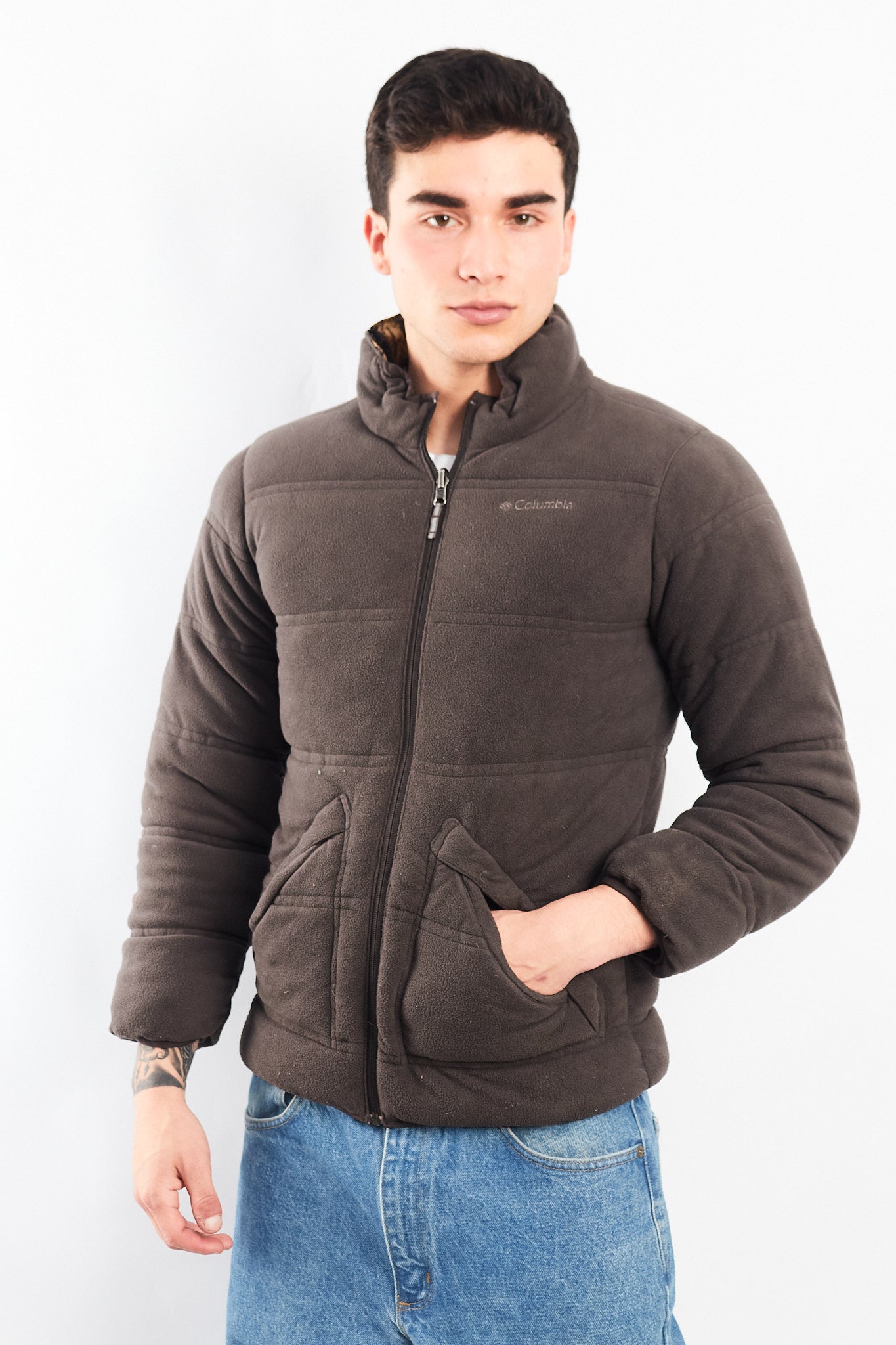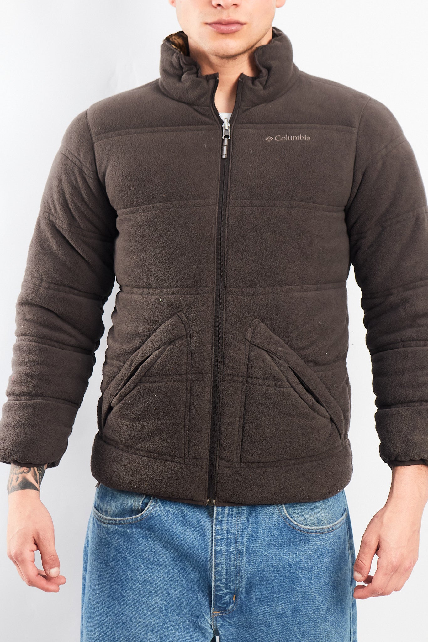 Por el otro lado es de polar color gris acolchado con bordado Columbia en el pecho con 2 bolsillos con cierre.