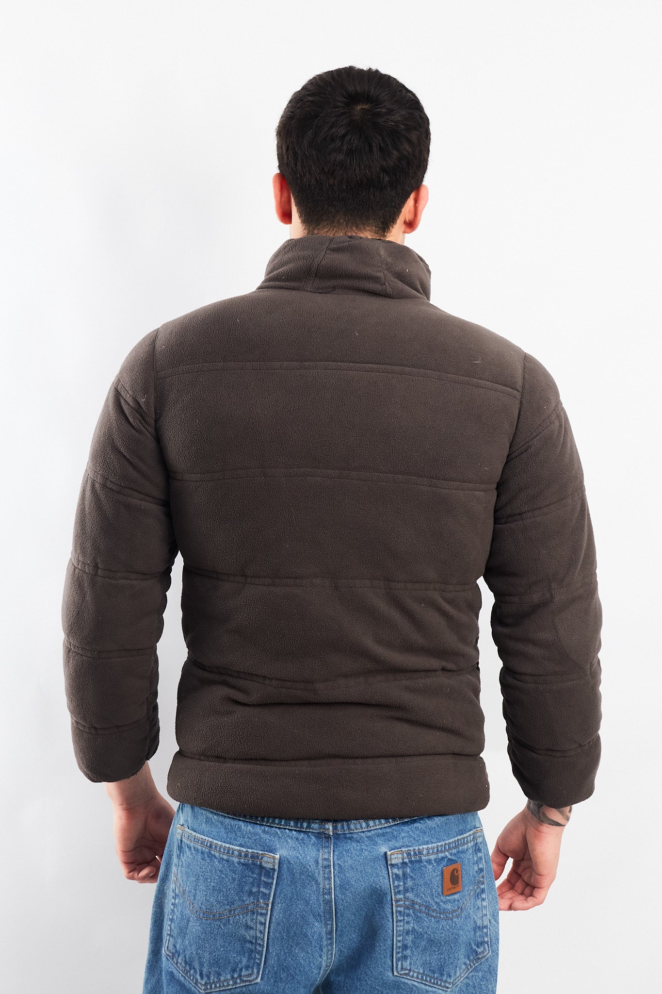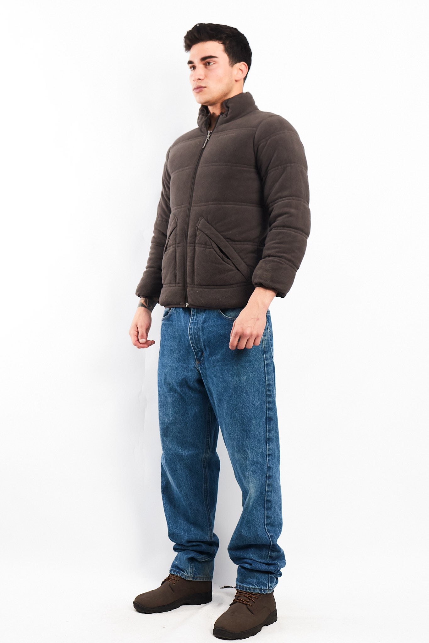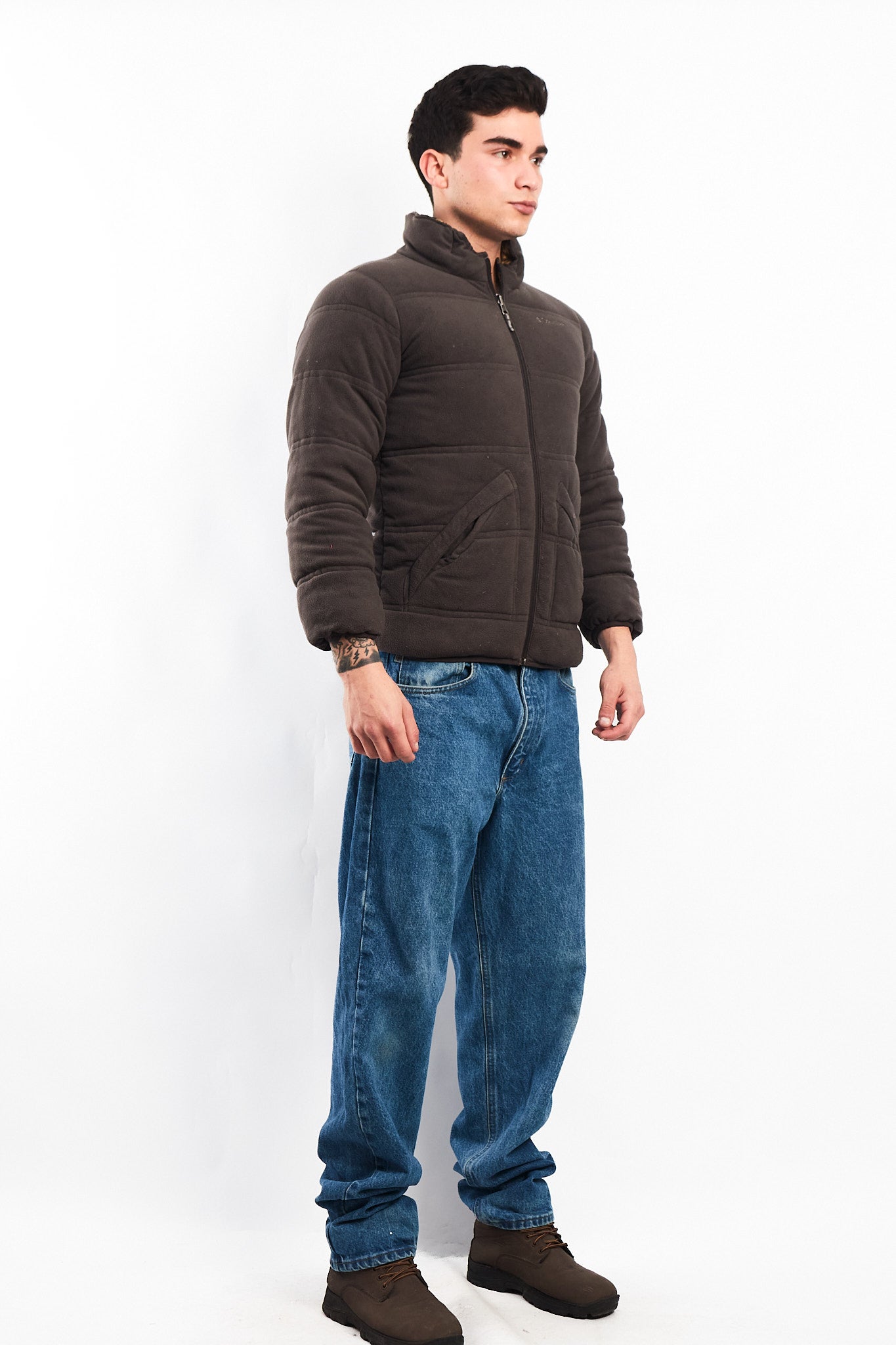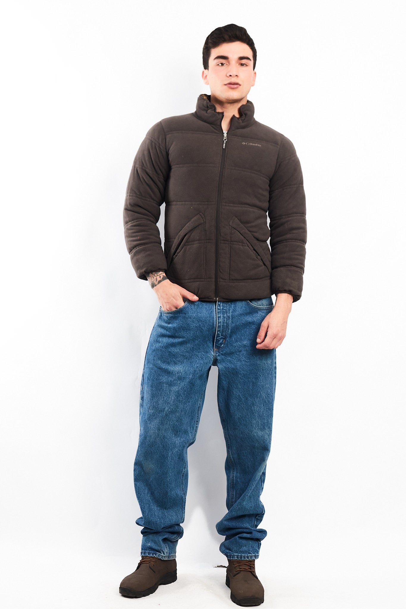 Por el otro lado es de polar color gris acolchado con bordado Columbia en el pecho con 2 bolsillos con cierre.