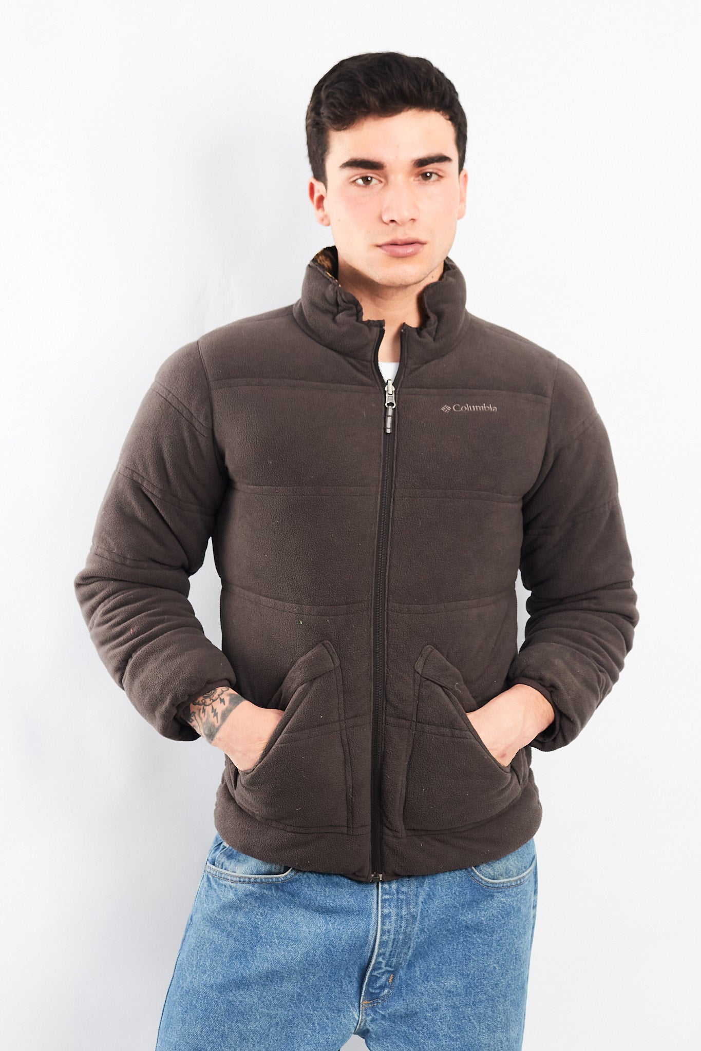 Hecho de 100% polyester con relleno de 100% plumas. Por un lado es diseño camuflado tipo realtree. Cuenta con bordado Columbia en el pecho. Cuenta con 2 bolsillos.