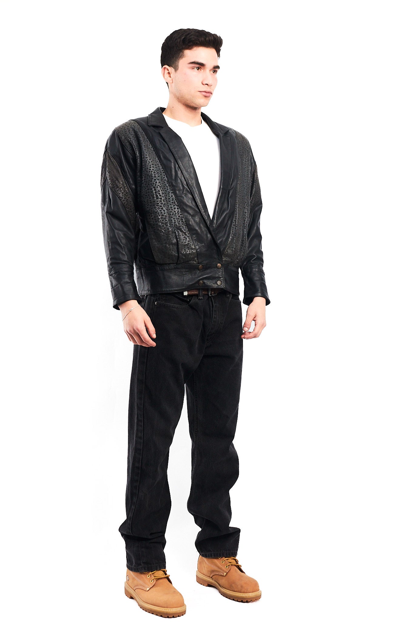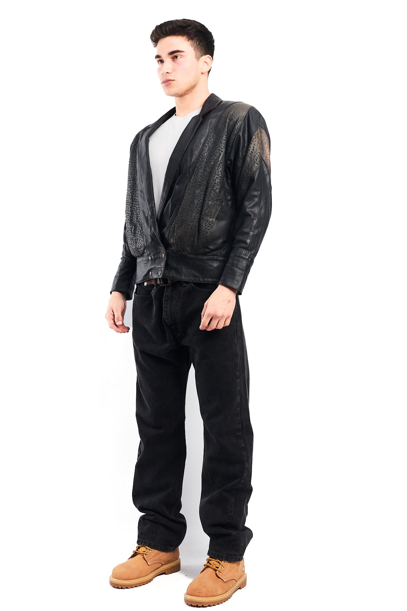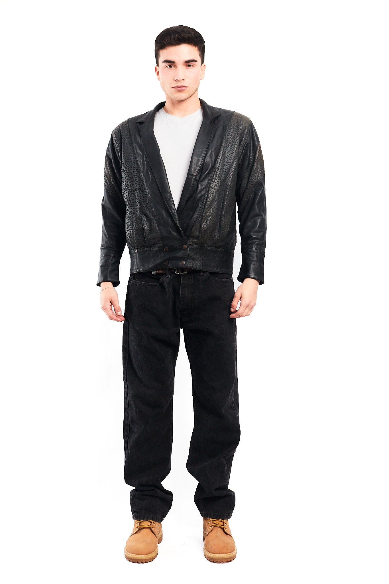 Hecho de 100% cuero genuino de ovino ( super suave al tacto y comodo al uso) Color negro con zonas animal print en los brazos con 2 bolsillos externos. Tiene broches con logo Renzo Costa en las mangas. Forro interno negro con bolsillo interior.