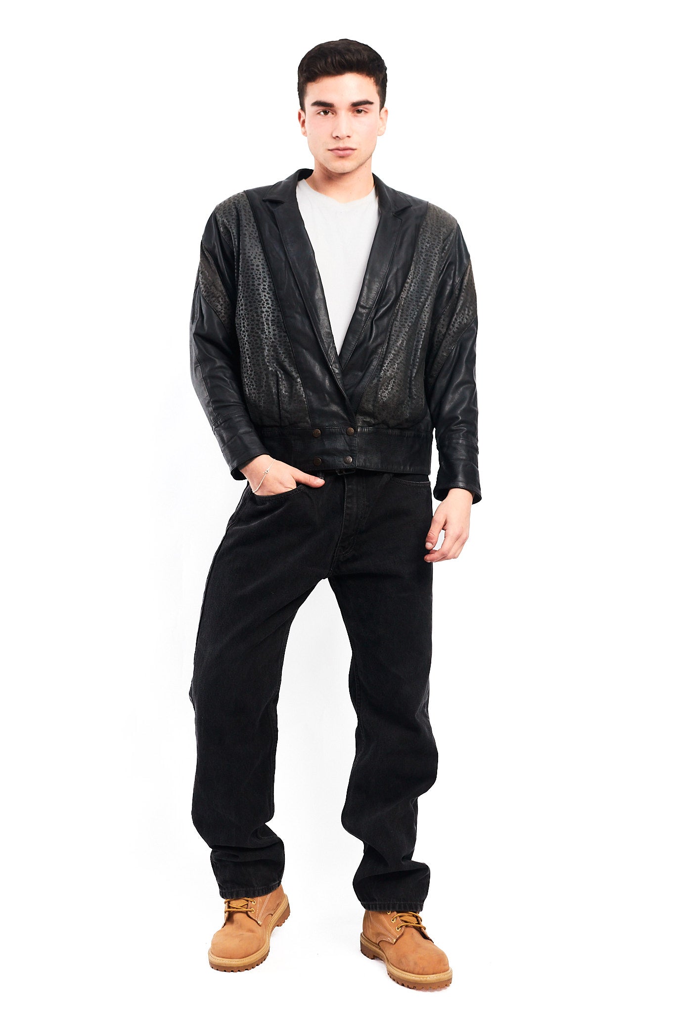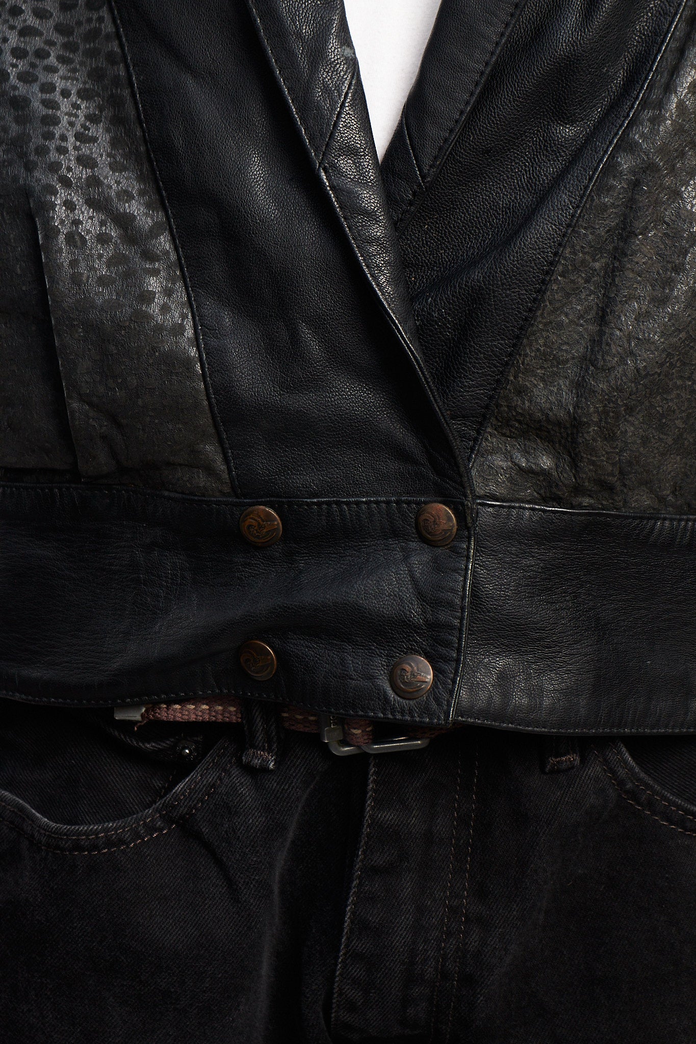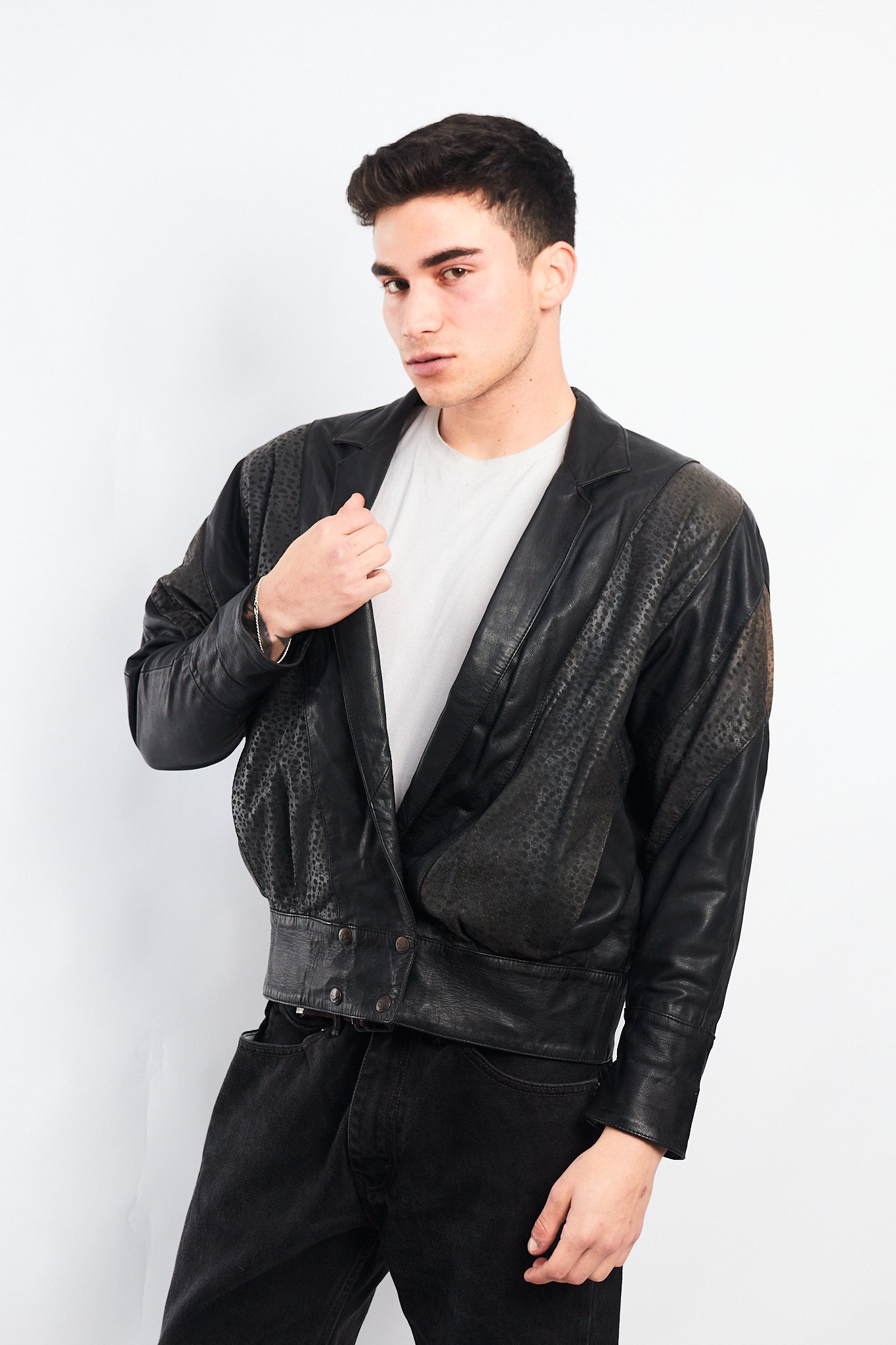 Hecho de 100% cuero genuino de ovino ( super suave al tacto y comodo al uso) Color negro con zonas animal print en los brazos con 2 bolsillos externos. Tiene broches con logo Renzo Costa en las mangas. Forro interno negro con bolsillo interior.