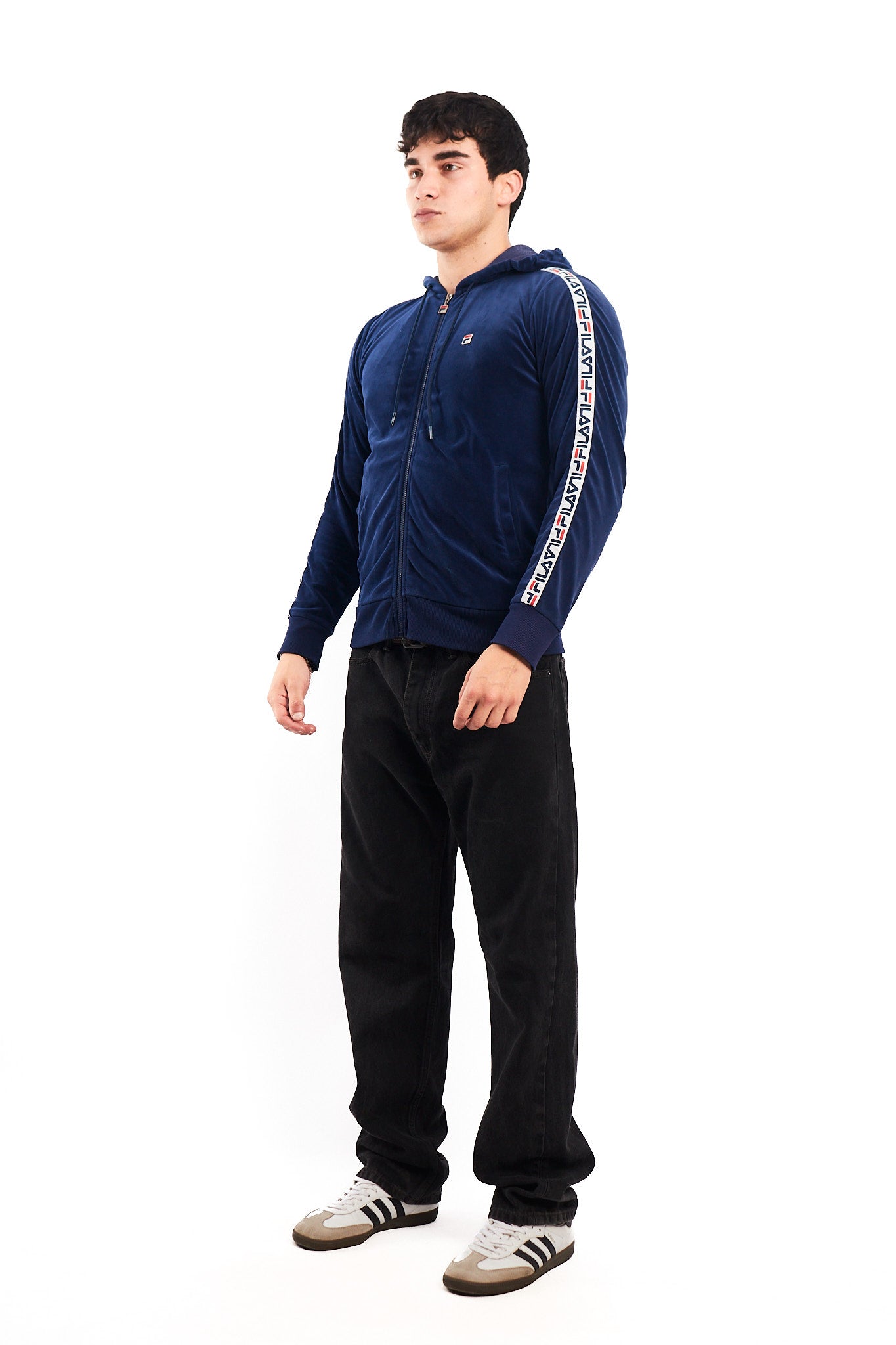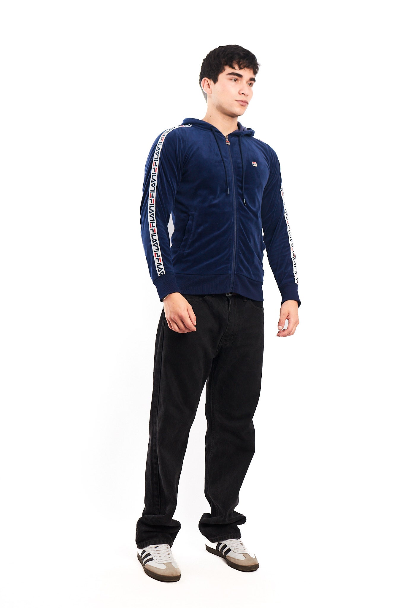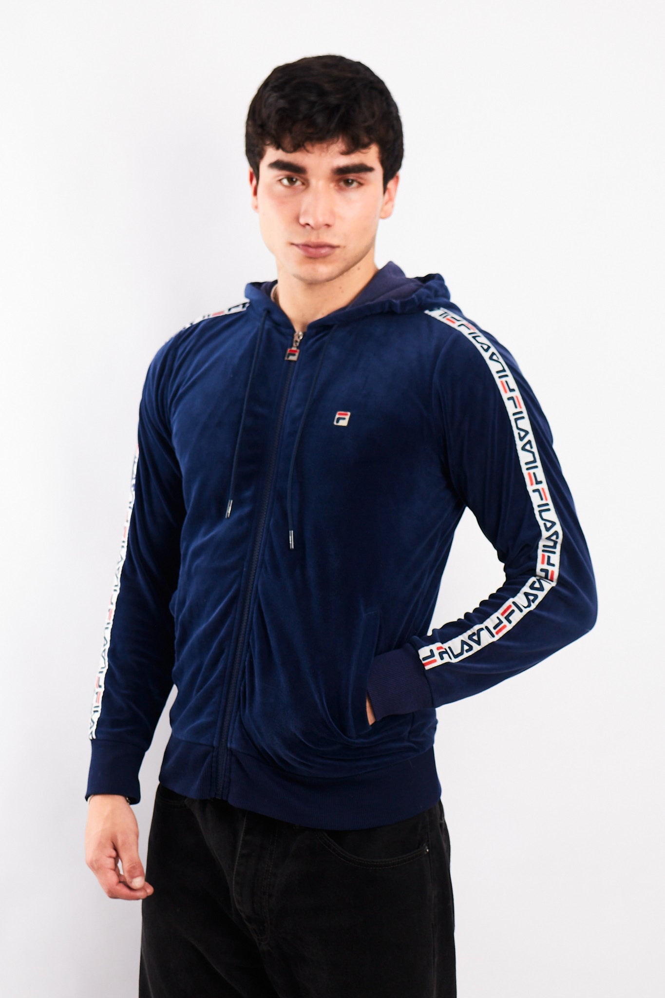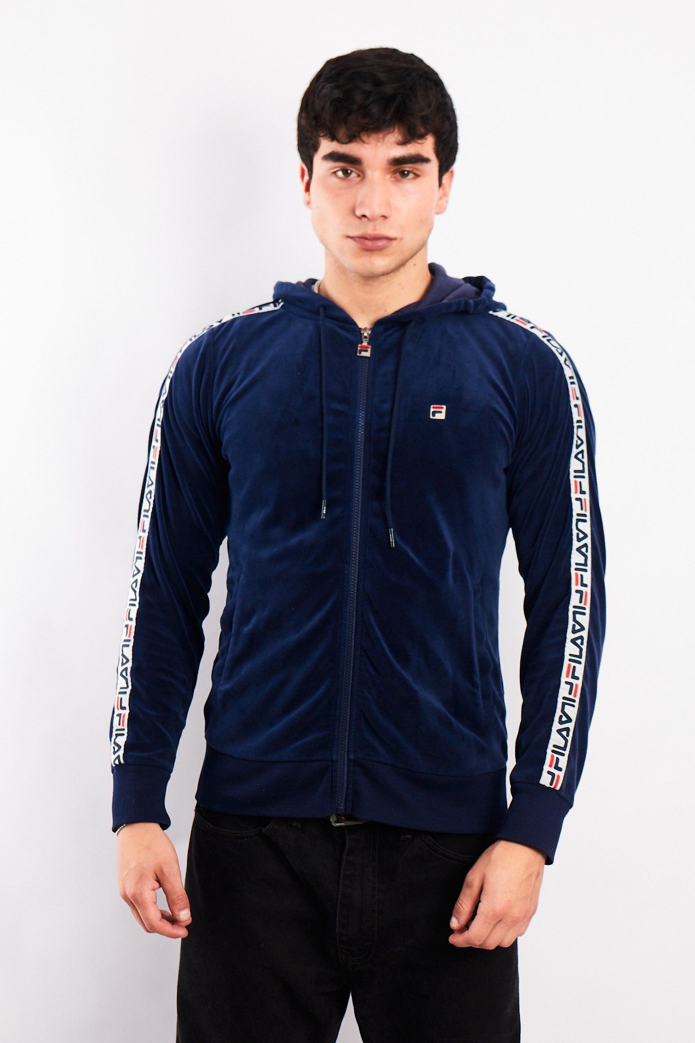 Hecho de 100% polyester. Color azul con franjas Fila en los brazos. Cuenta con 2 bolsillos externos . Tiene un bordado Fila en el pecho.