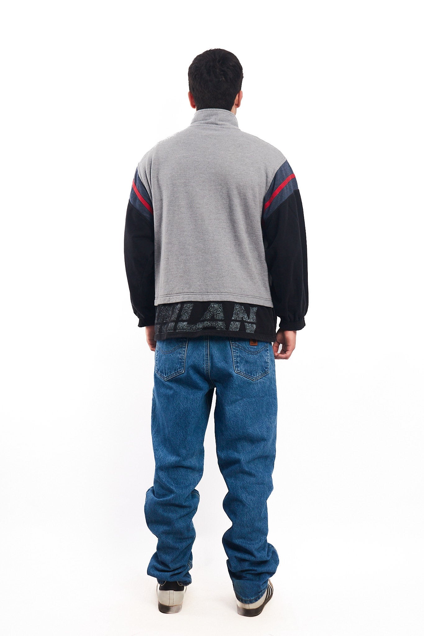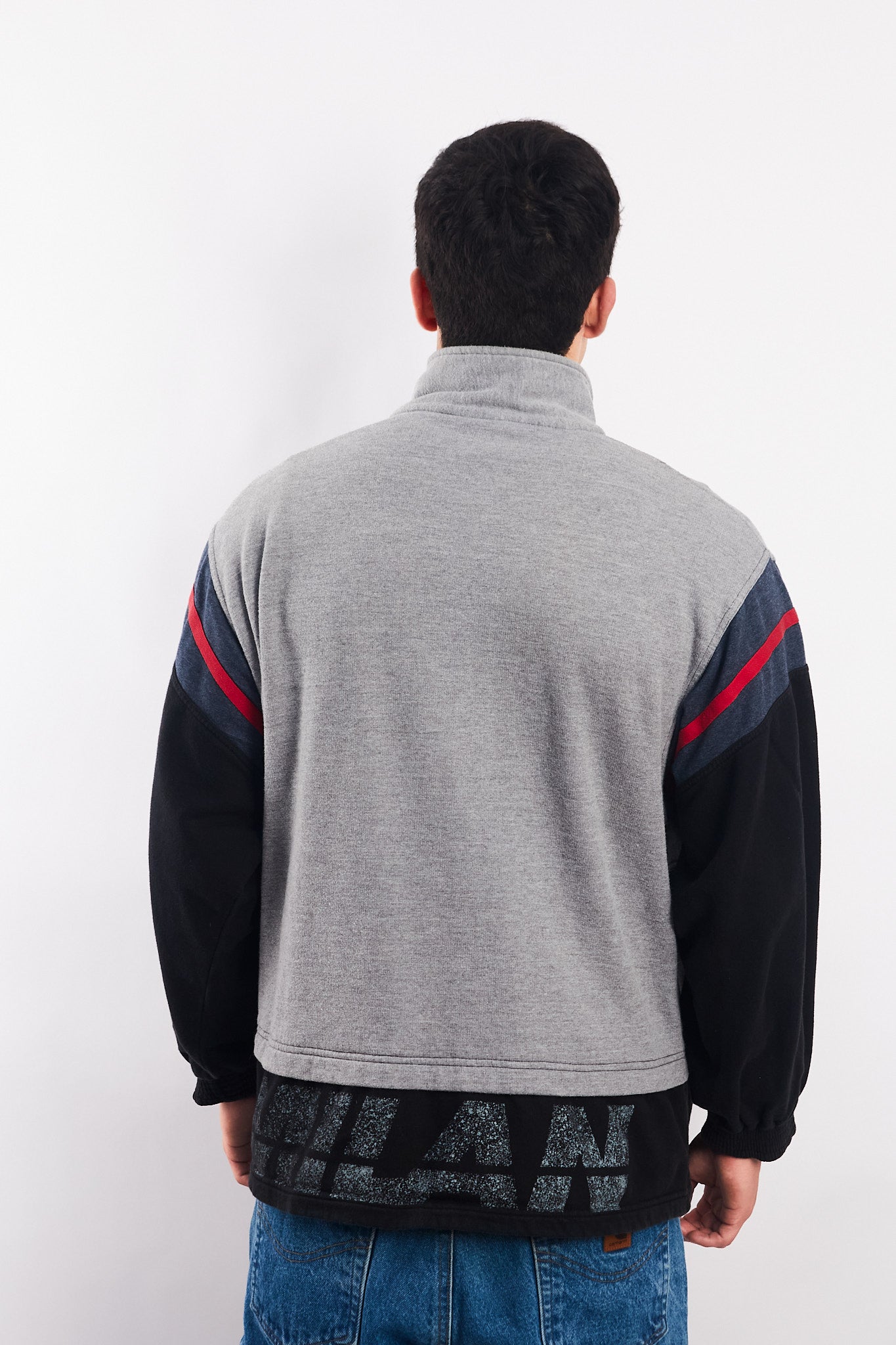 Hecho de 100% polyester. Color gris con partes negras y rojas. Tiene bordado Lotto y bordado Ac Milan. Cuenta con 2 bolsillos. En la espalda tiene un estampado Milán.