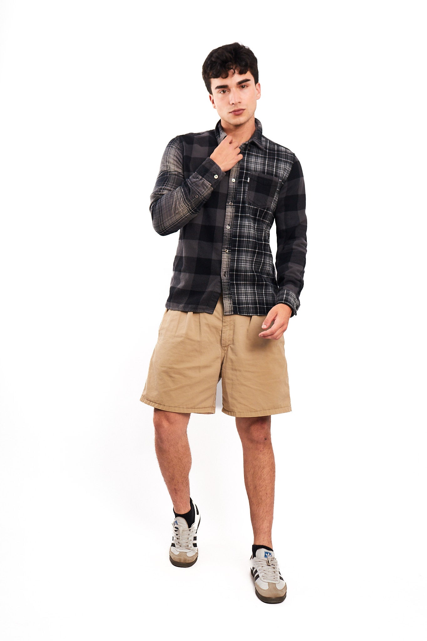 Diseño vintage cuadrillé con colores negro, gris y blanco. Cuenta con un bolsillo delantero y mangas con cuello abotonadas.