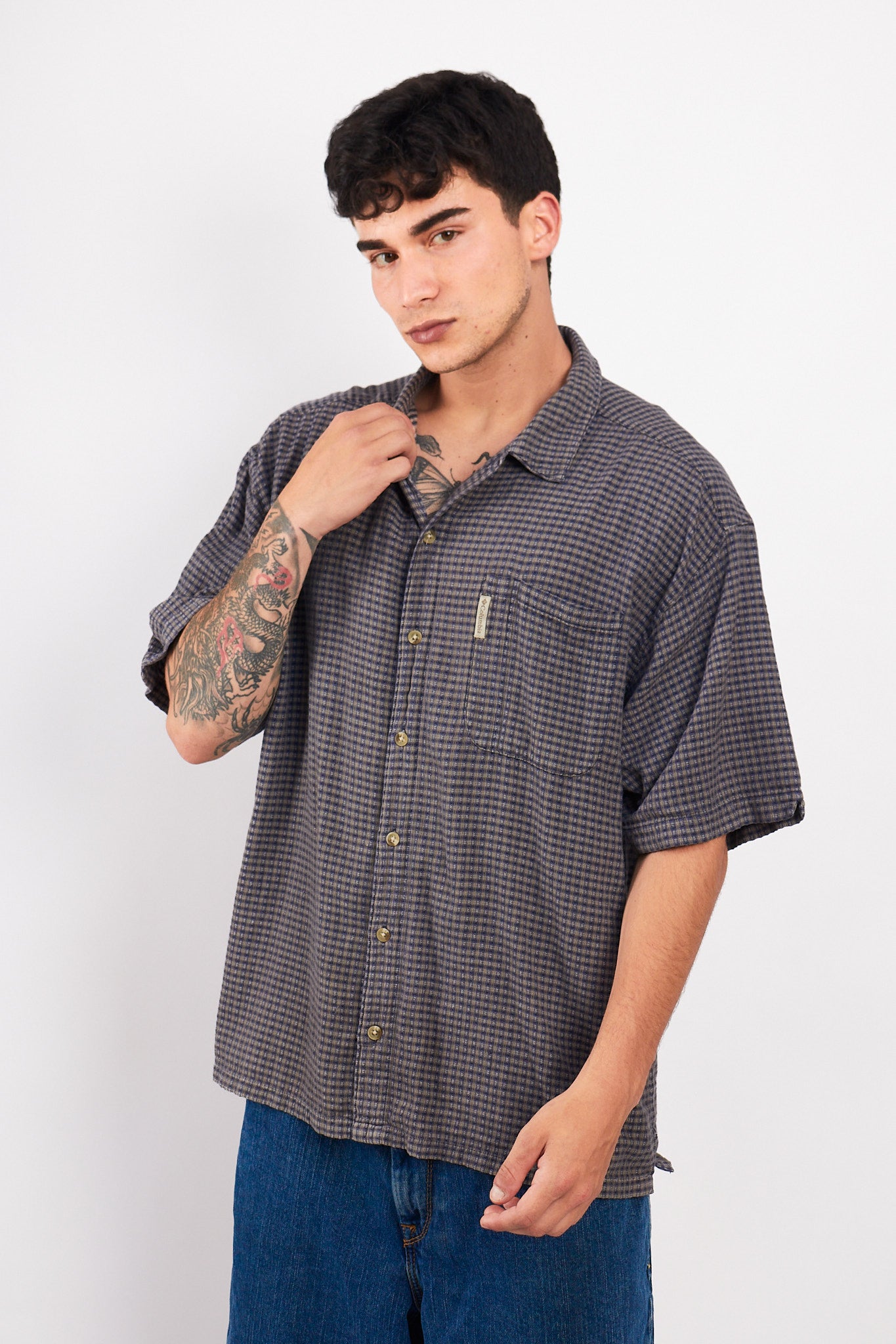 Diseño vintage con patrón de cuadrícula en tonos oscuros, predominante el azul y gris. Cuenta con un bolsillo delantero. Tiene una etiqueta de la marca en el pecho.