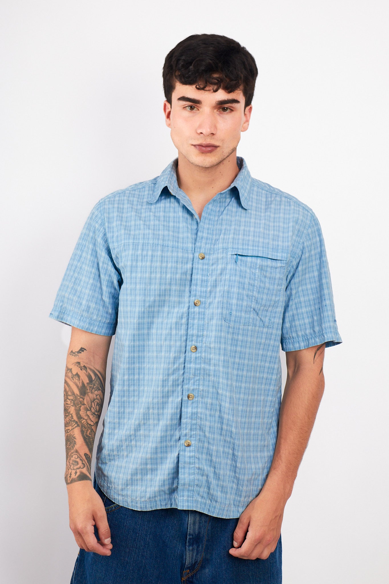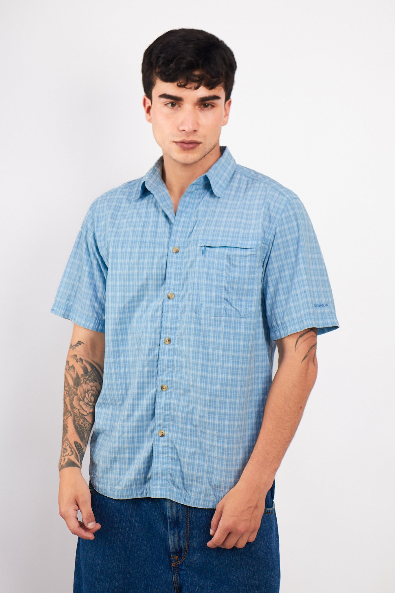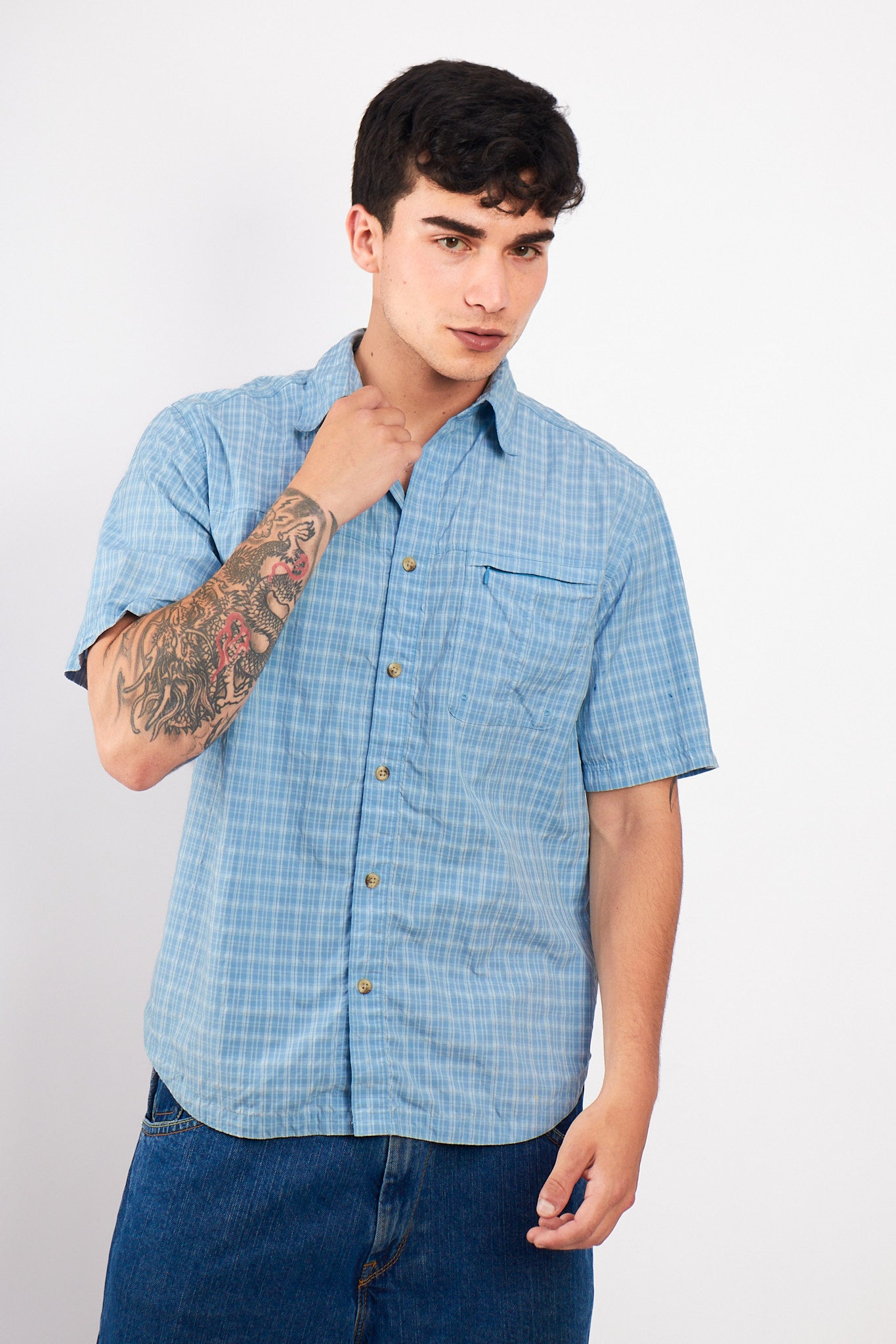 Diseño a cuadros vintage color celeste y blanco. Cuenta con un bolsillo delantero con cierre celeste. Tiene una etiqueta de la marca por el lado izquierdo de la prenda.