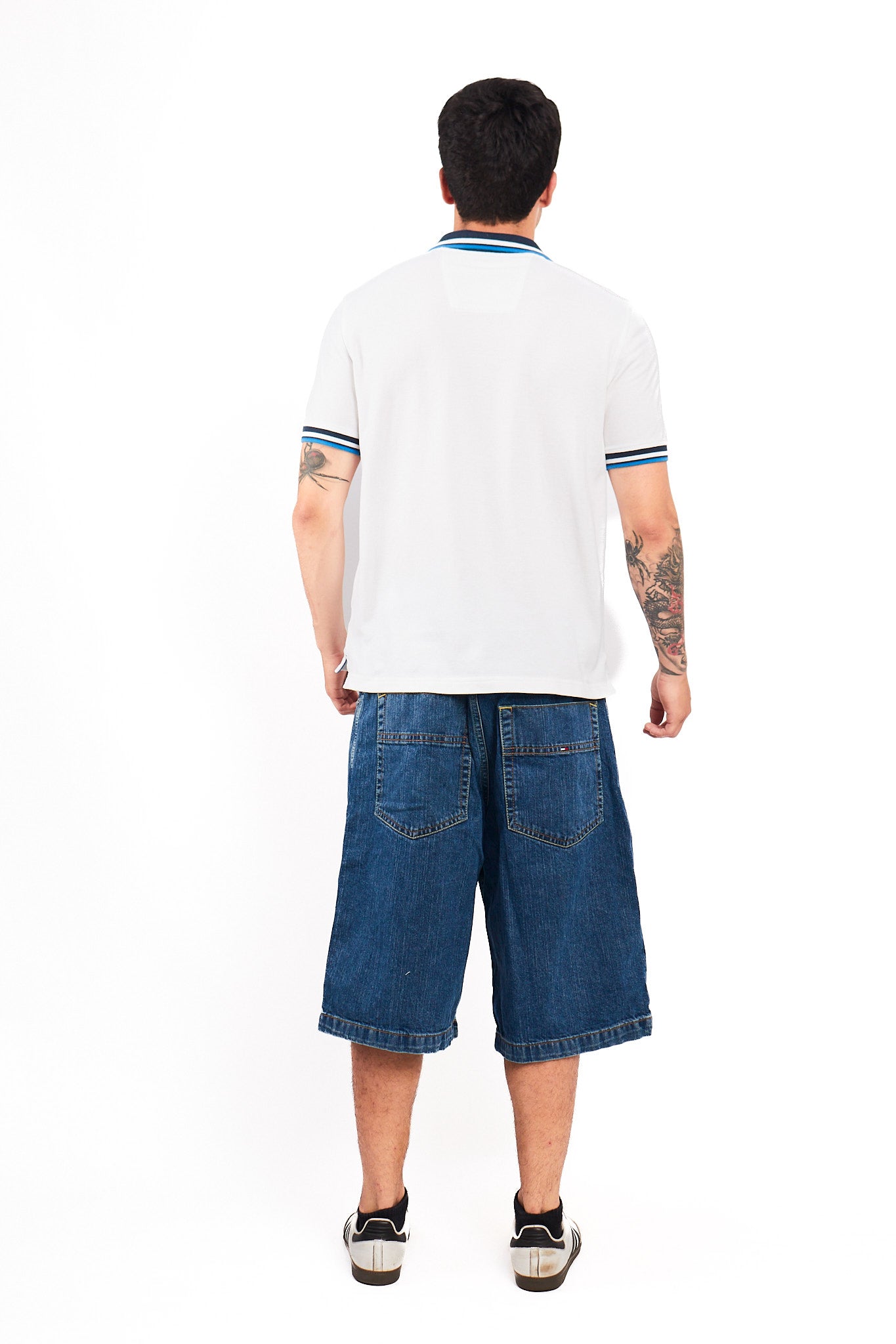 Diseño vintage color blanco entero con franjas con tonalidades azules en cuello y basta. Cuenta con cuello camisero con botones originales.