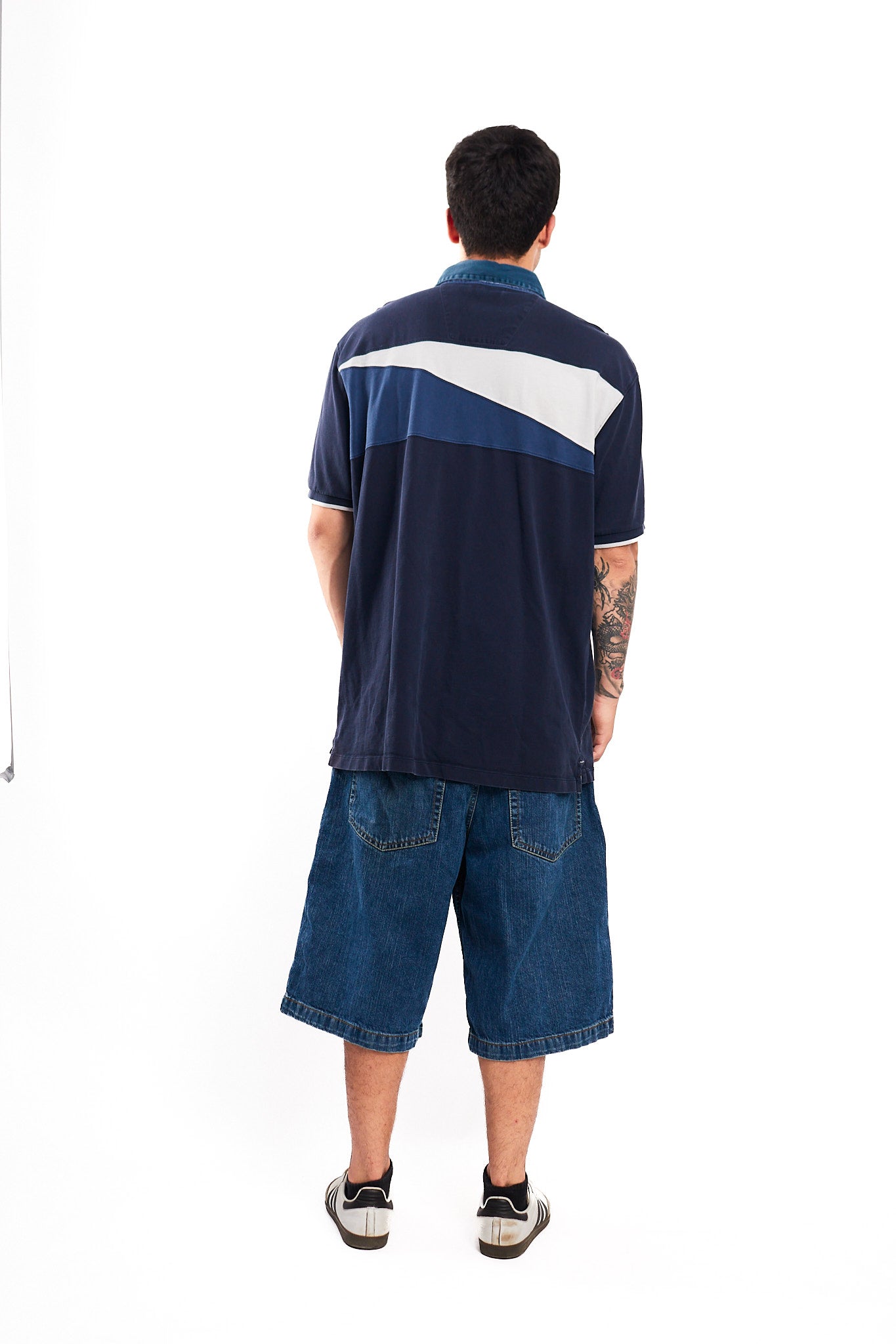 Diseño vintage color azul noche y franja blanca en el pecho. Cuenta con cuello camisero y botones originales. Tiene parche de insignia de la marca Náutica en el pecho y etiqueta en la basta.