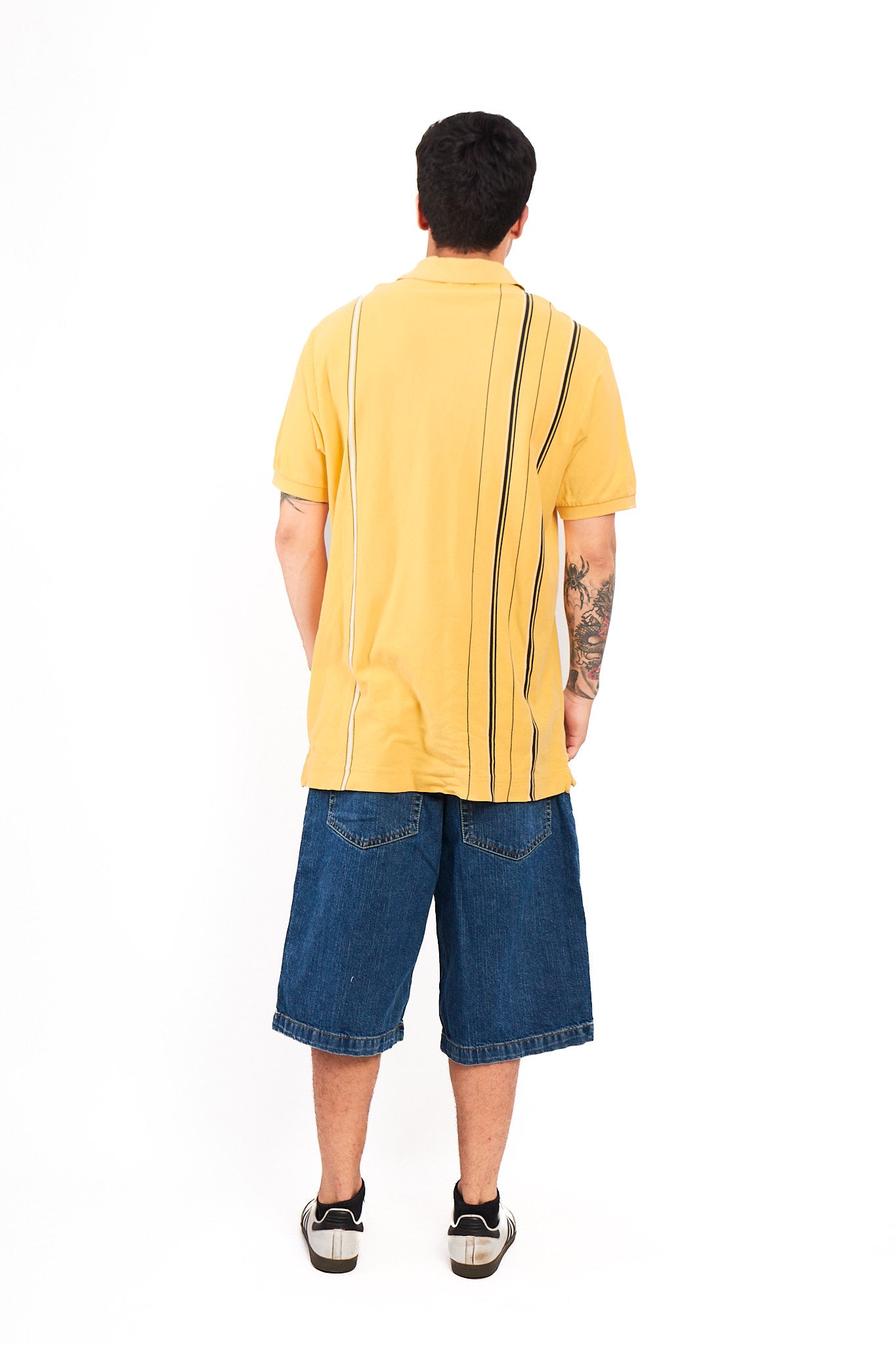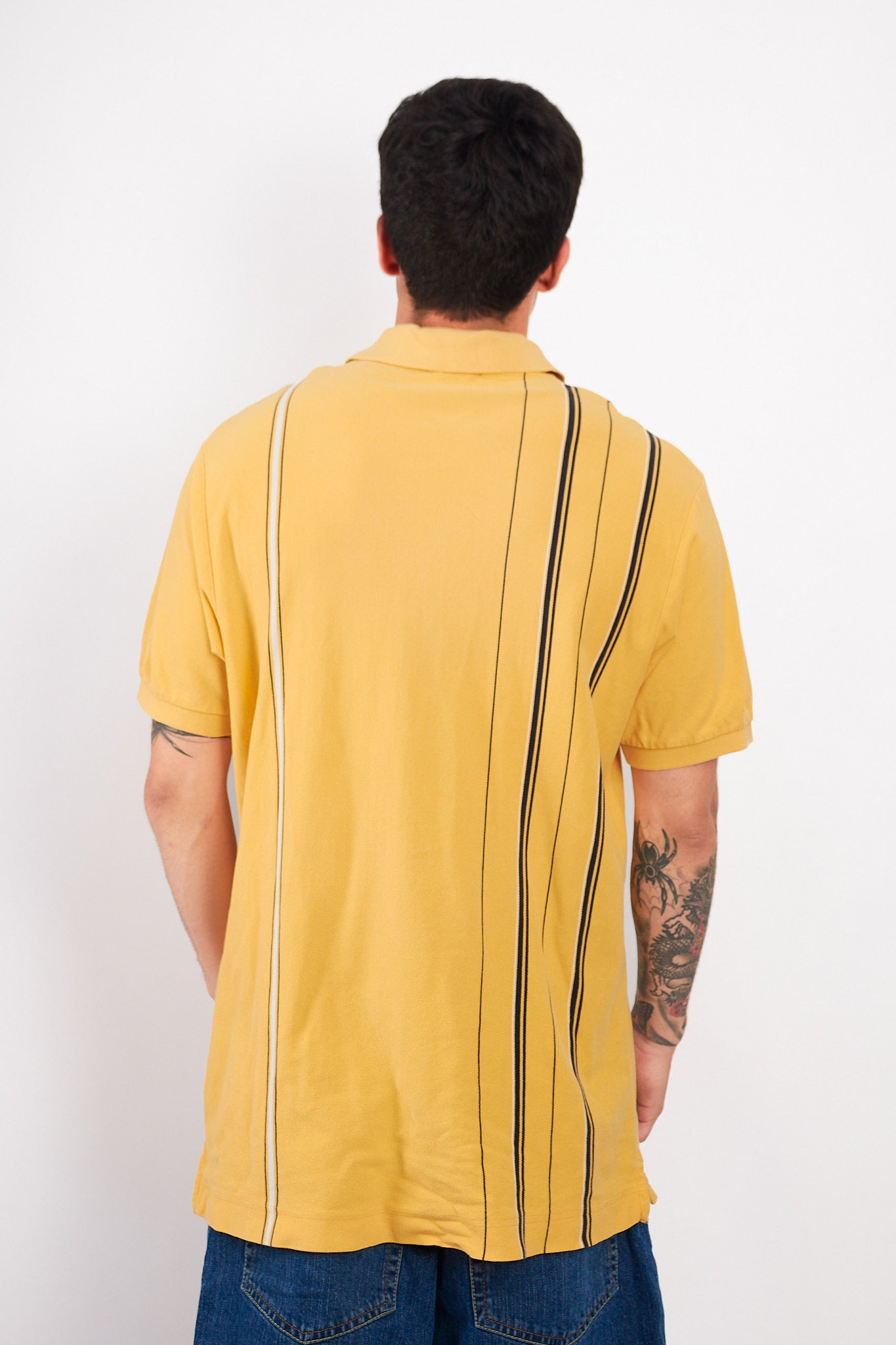 Diseño vintage color amarillo con rayas verticales color azul noche y blanco. Cuenta con cuello camisero. Tiene bordado en color azul noche del logo en el pecho.