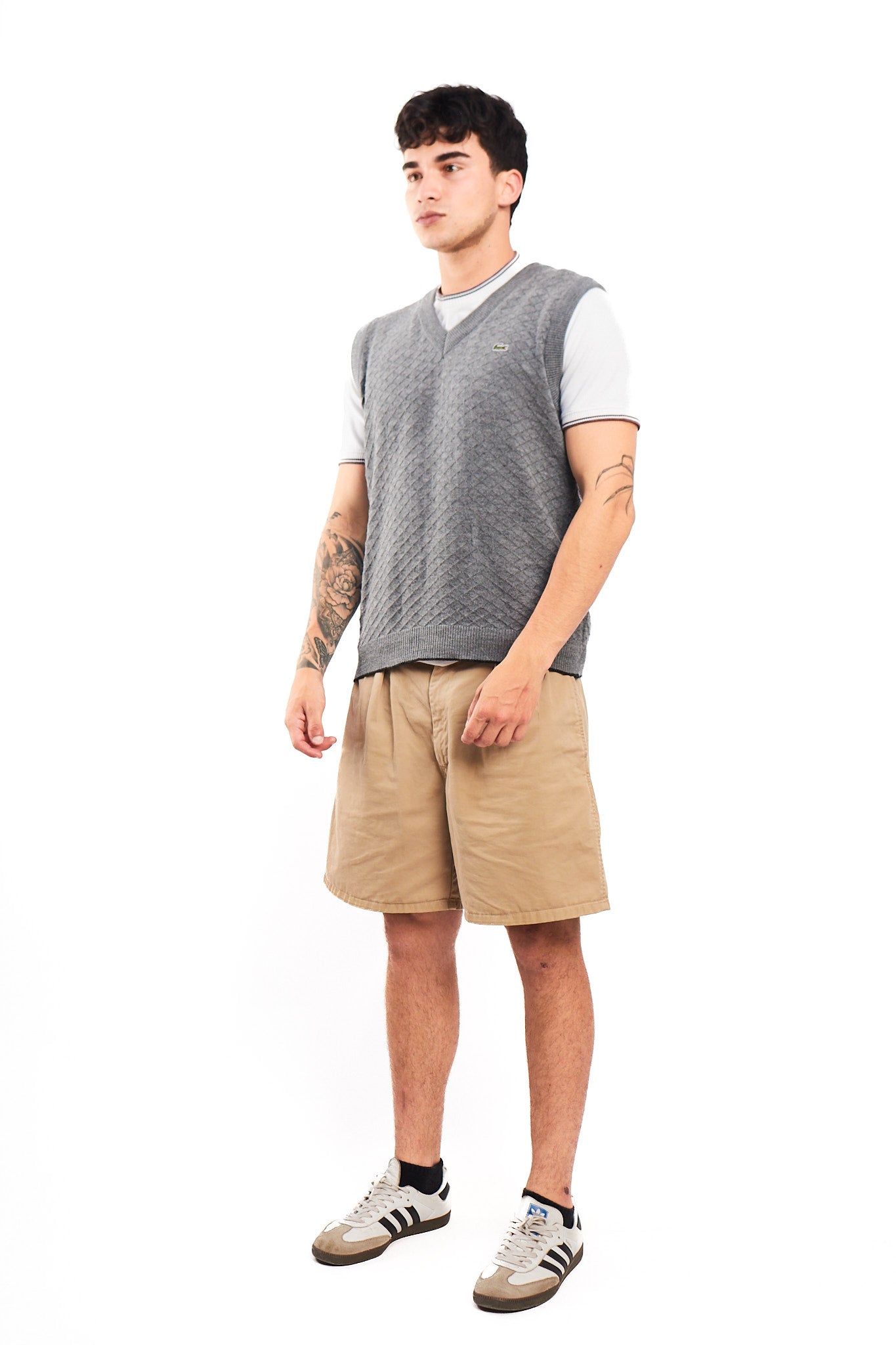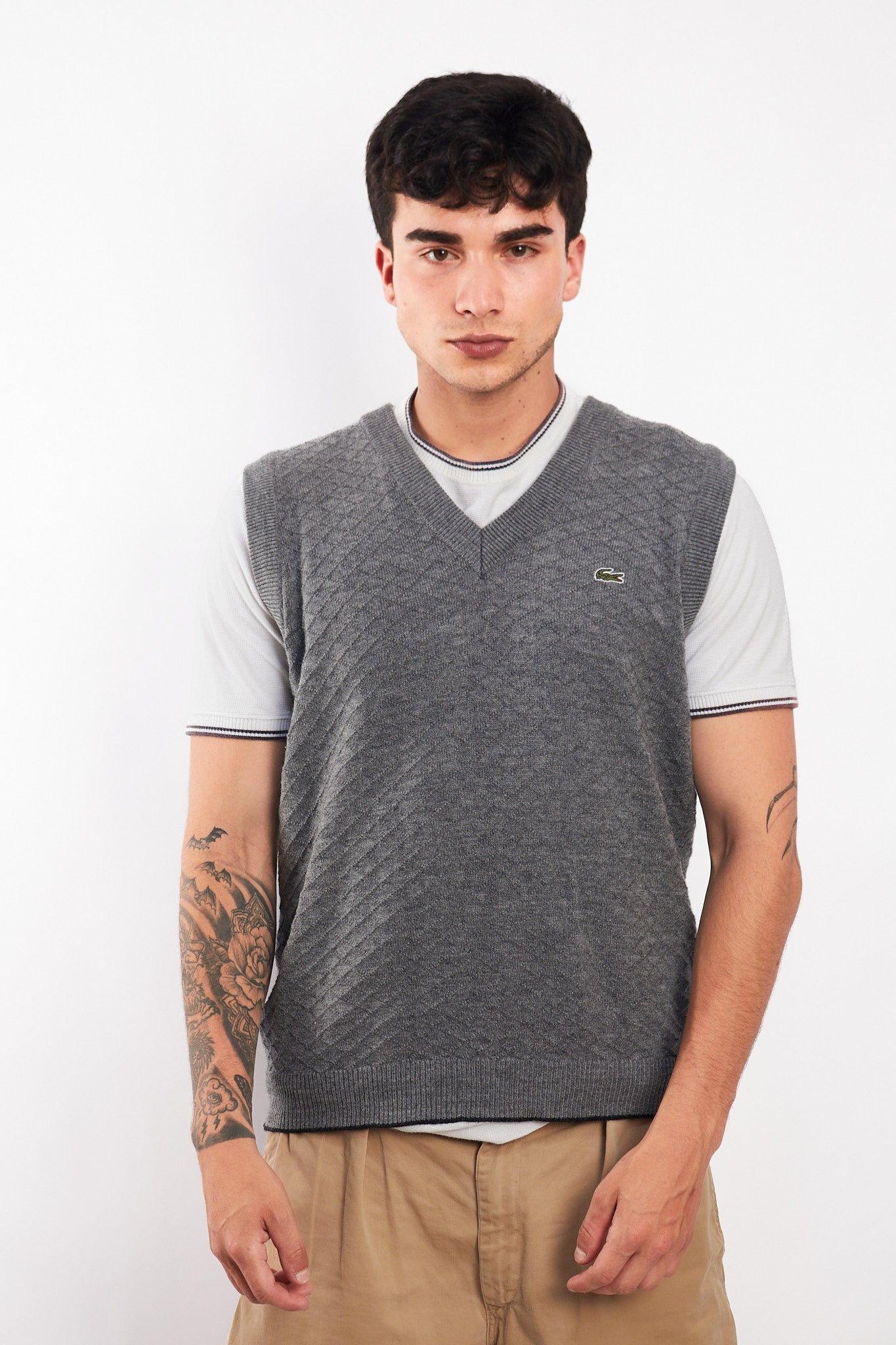 Diseño vintage color gris entero. Cuenta cuello corte en V y patrones en rombo bordados gris. Tiene bordado de el logo de la marca en el pecho.