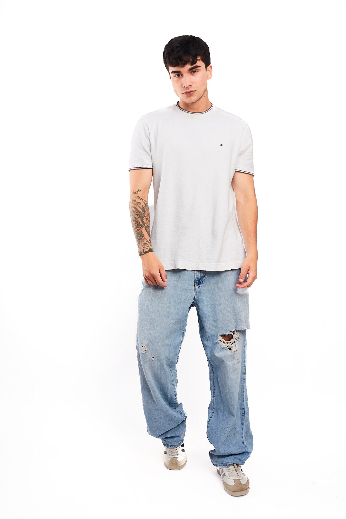 Hecho de 100% algodón . Color hielo super combinable y va con todo. Modelo rasgado en la pierna. Tiene etiqueta de cuero y etiqueta de tela Calvin Klein Jeans en el bolsillo delantero. El fit es suelto.