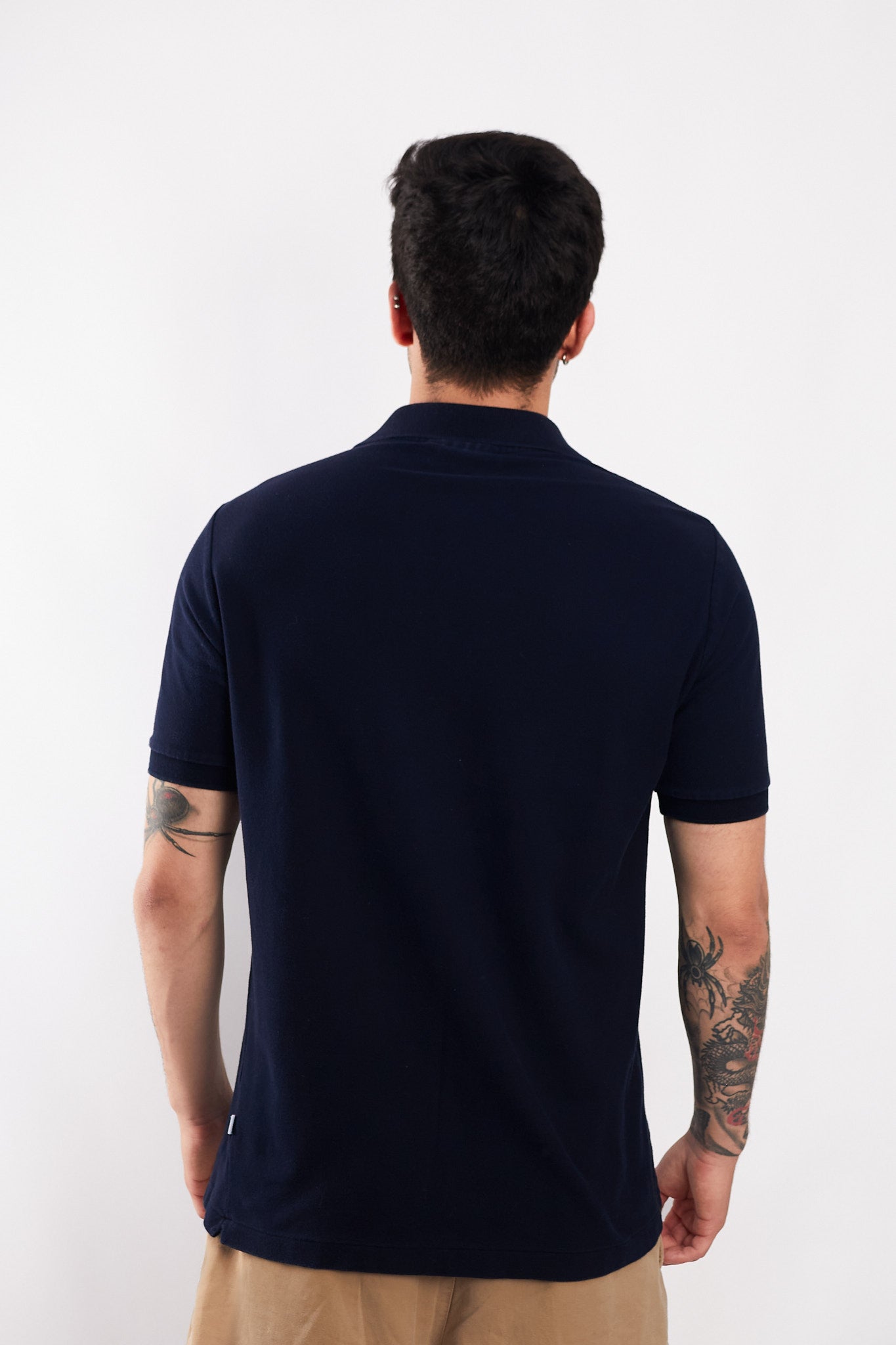 Tiene bordado de la marca en el pecho y etiqueta del cocodrilo en lado izquierdo cerca a la basta.