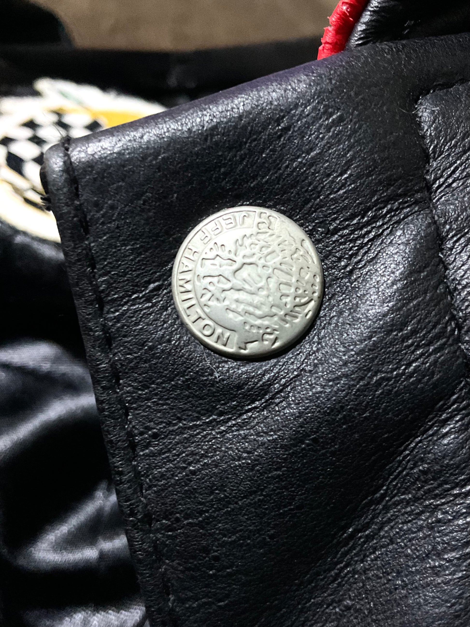 Prenda de colección hecha entre el 2001 y 2003 por el famoso diseñador de prendas de artistas y deportistas Jeff Hamilton, pertenece a su línea "Racing Collection" Usada por el corredor Kevin Harvick en la descontinuada Nascar Winston Cup. En toda la internet no existe ninguna hecha de cuero, una igual pero de algodón la venden en 439 dolares ( 1300 soles)