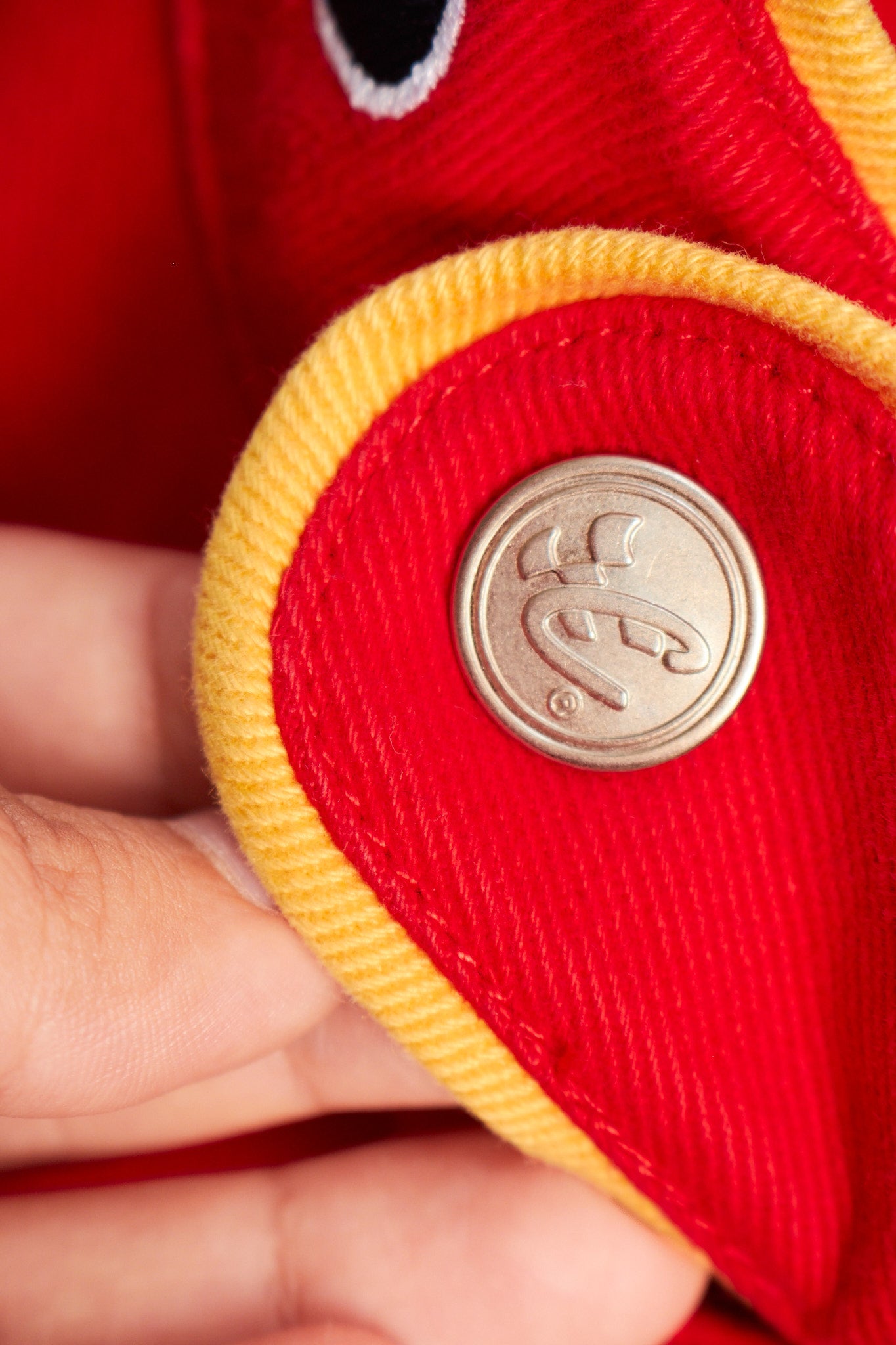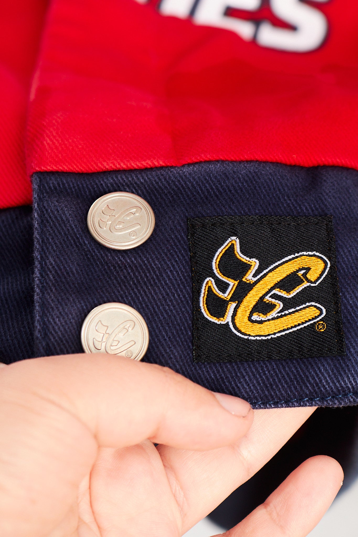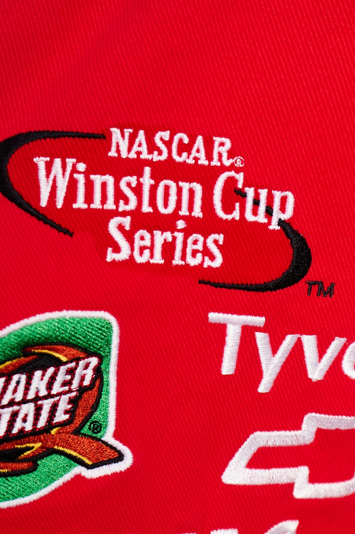 Hecho de 100% algodón pesado (lona). Color rojo y azul marino con diseño de flamas bordados en los brazos. Cuenta con bordado Dupont y bordado de auspiciadores como Pepsi, Chevrolet y la competencia Nascar Winston Cup y un bordado Dupont toda la espalda.