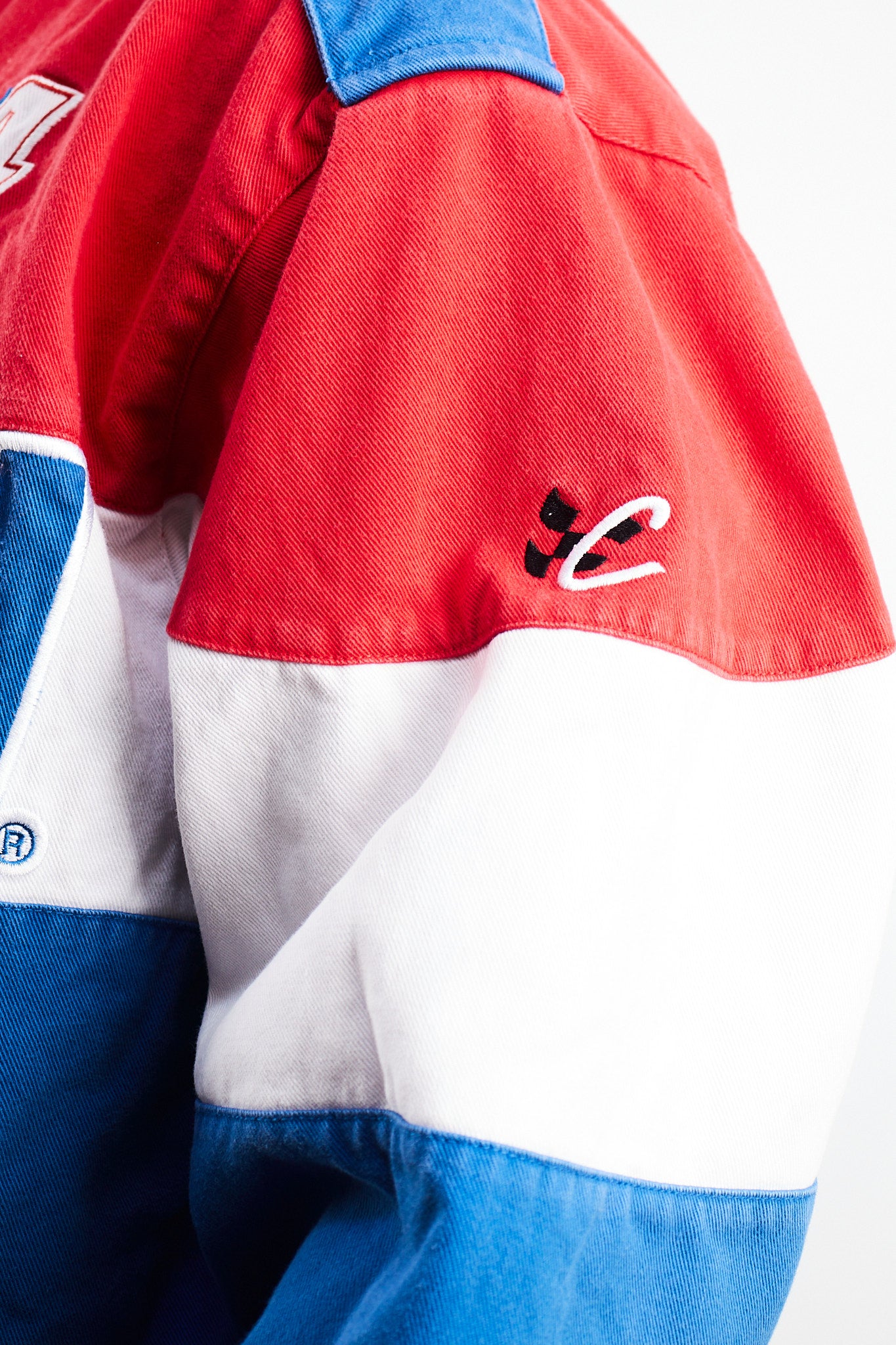 Hecho de 100% algodón pesado (lona). Color rojo blanco y azul. Cuenta con bordado con la firma de Jeff Gordon, bordado Pepsi en el pecho, el #24 y un bordado en toda la espalda Pepsi.