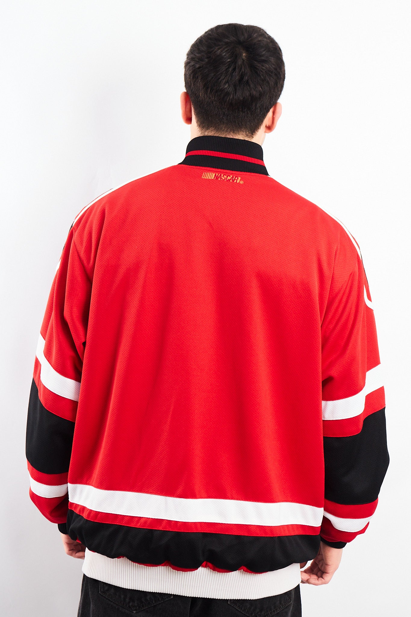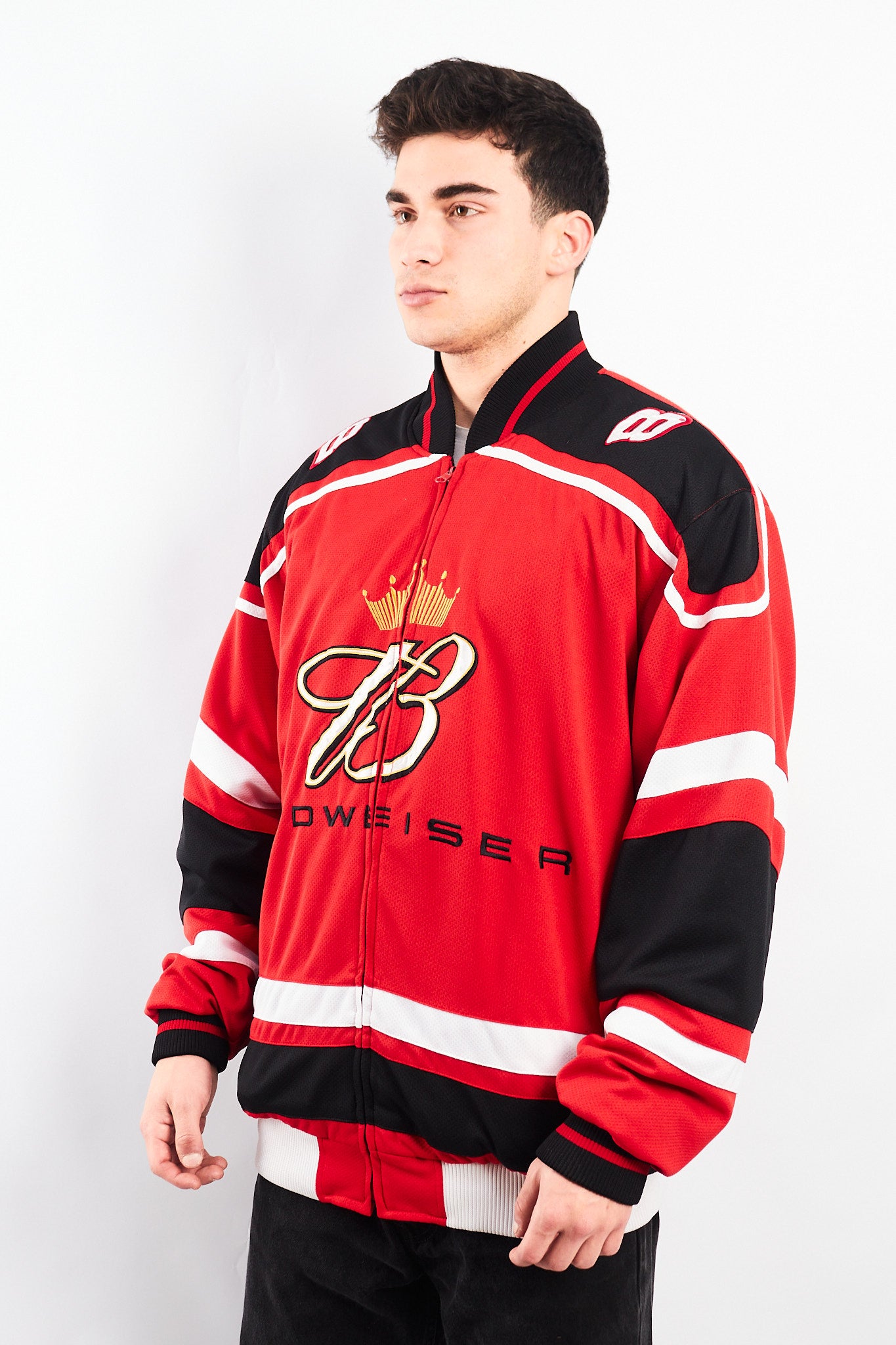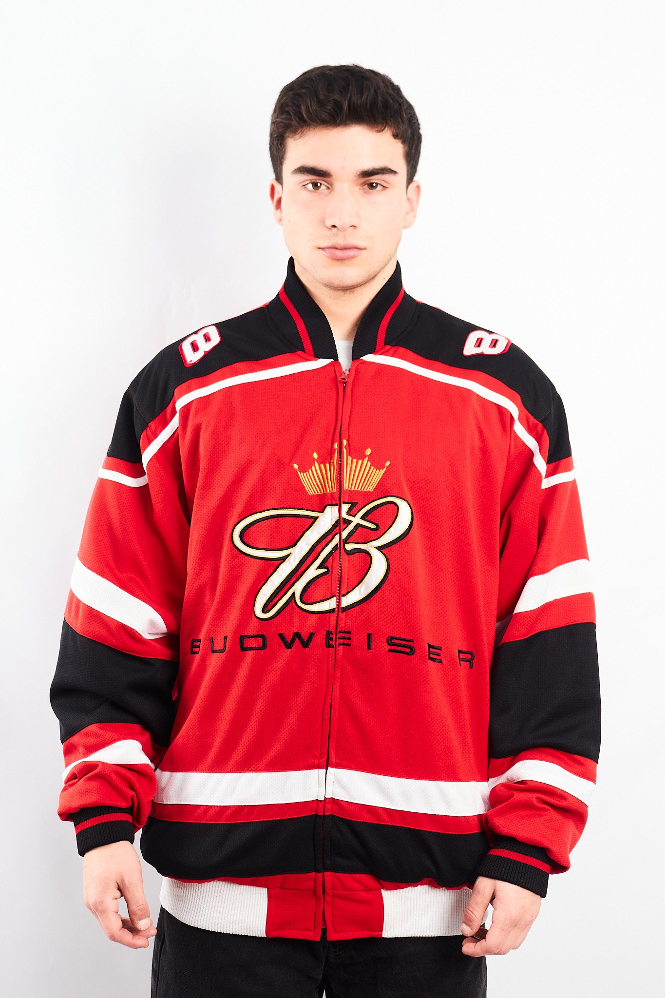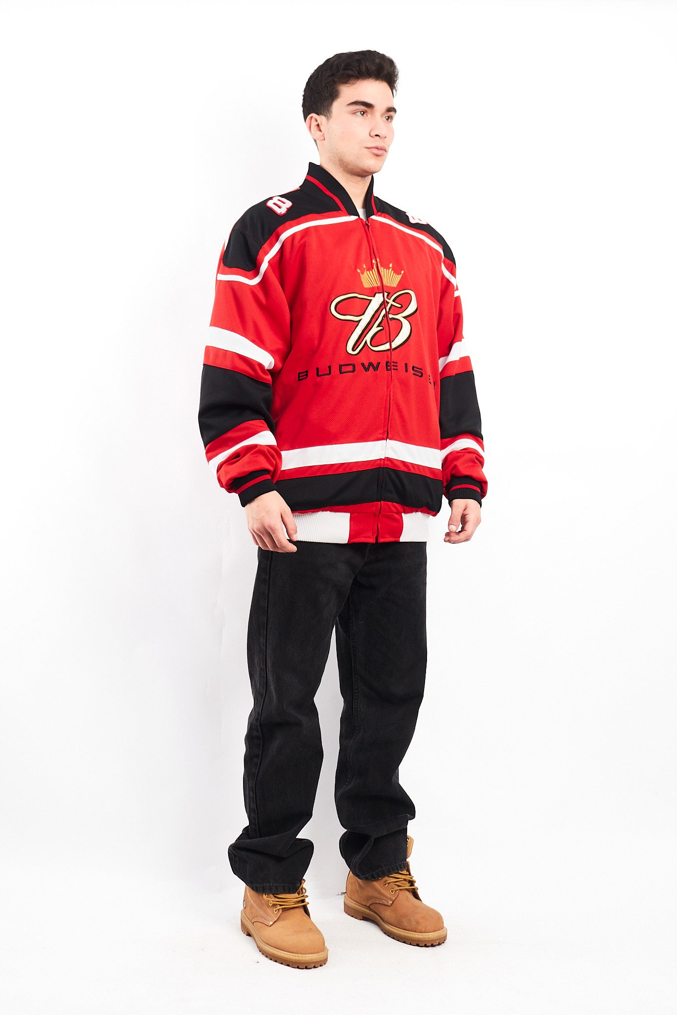 Hecho de 100% algodón grueso (lona). Por un lado es rojo , negro y blanco. Cuenta con bordado Budweiser en el pecho y un bordado Nascar atrás.