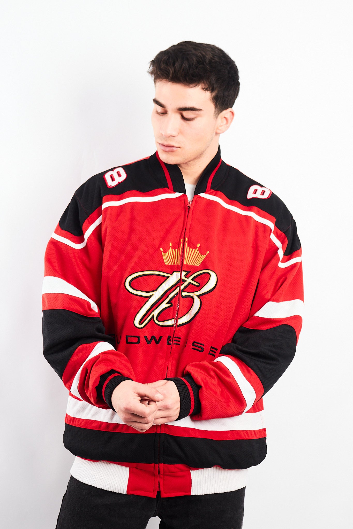 El otro lado es negro y rojo. Tiene bordado en el pecho Dale JR, bordado Budweiser en los brazos.