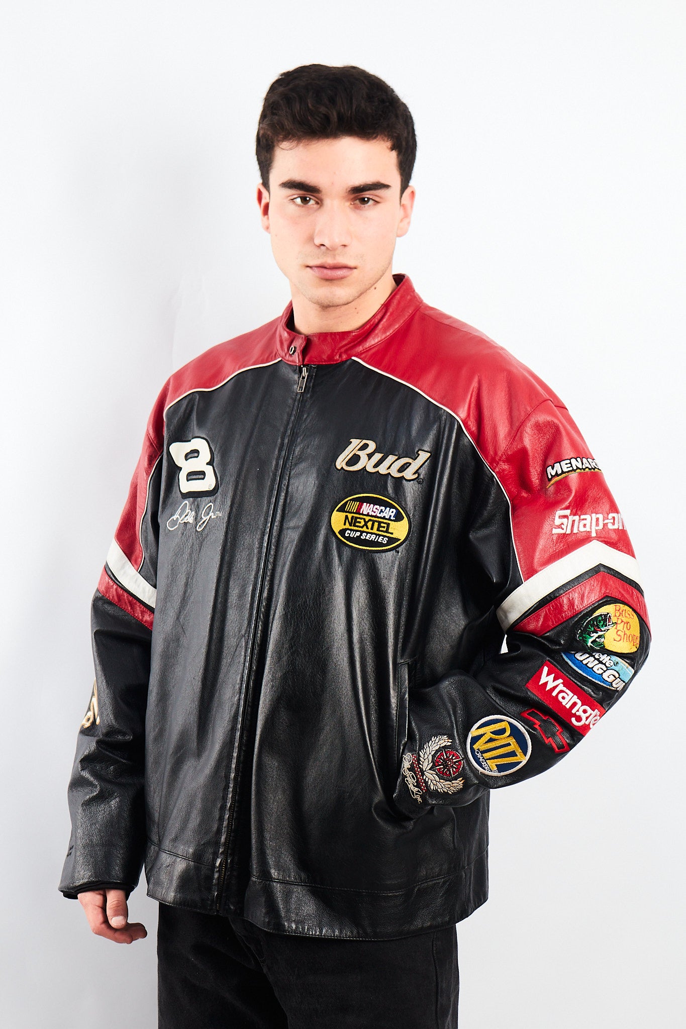 Hecho de 100% cuero genuino de res. Cuenta con bordado de la firma del famoso piloto Dale Earnhardt JR, además del bordado de la competencia Nascar Nextel Cup y el número de carro 8,En los brazos tiene un bordado de Budweiser y en lotro diversos auspiciadores como Chevrolet, Ritz, Wrangler En la espalda big logo Budweiser.