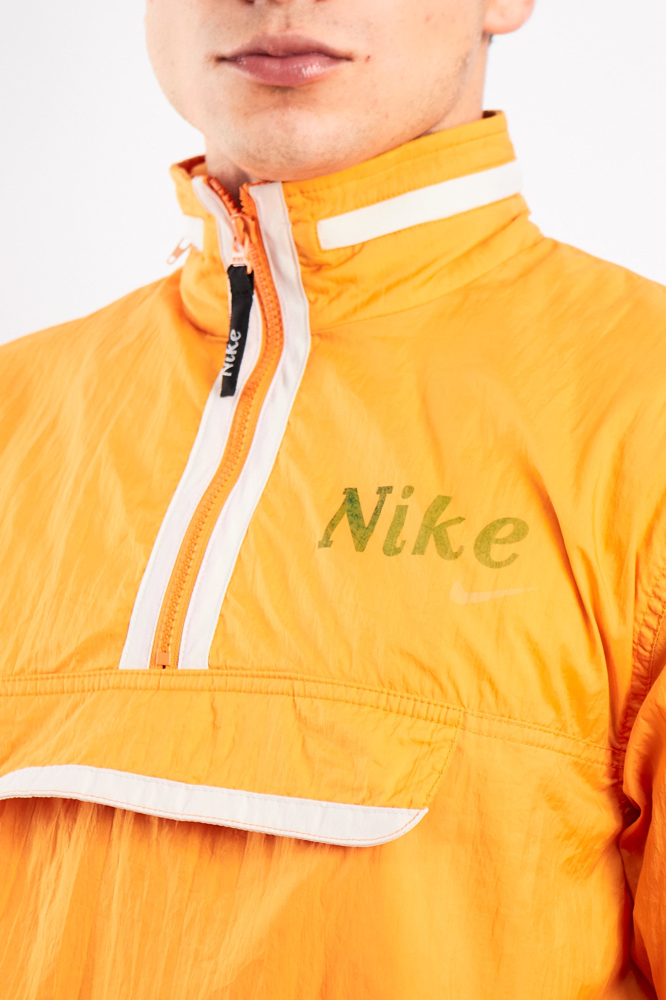 Hecho de 100% nylon. Color naranja con estampado Nike en el pecho. Cuenta con bolsillo canguro. Cuenta con capucha oculta con cierre en el cuello.