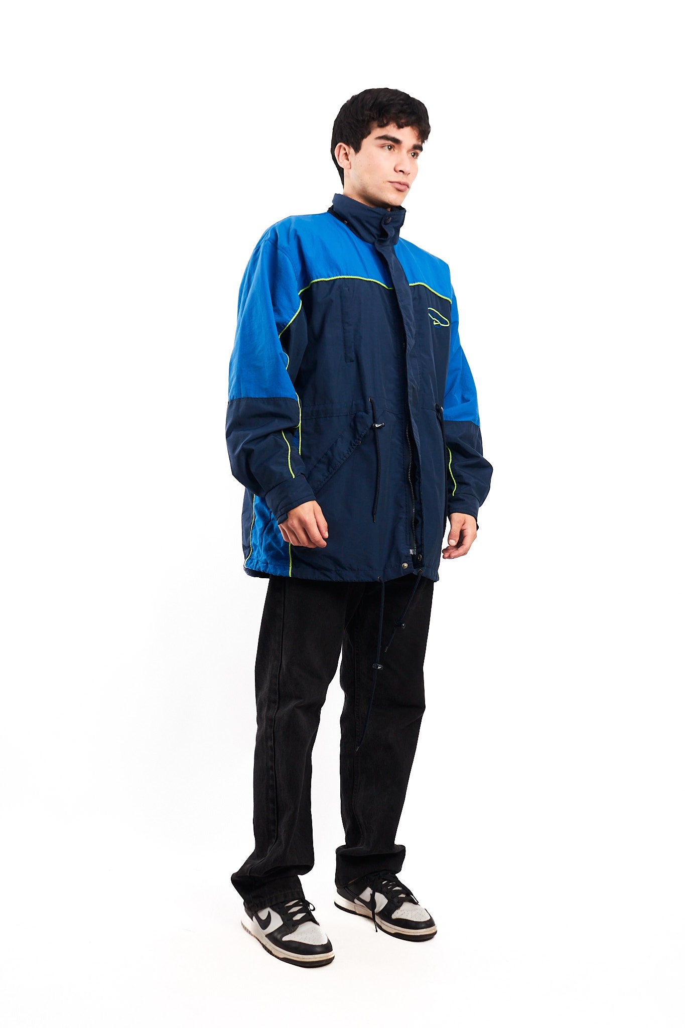 Hecho de 100% nylon. Color azul marino, azul eléctrico y franjas verde fosforecente. Cuenta con un bordado Nike en el pecho, el swoosh bordado en la parte inferior y bordado Nike en la espalda. Cuenta con 3 bolsillos con cierre. Forro interno azul.