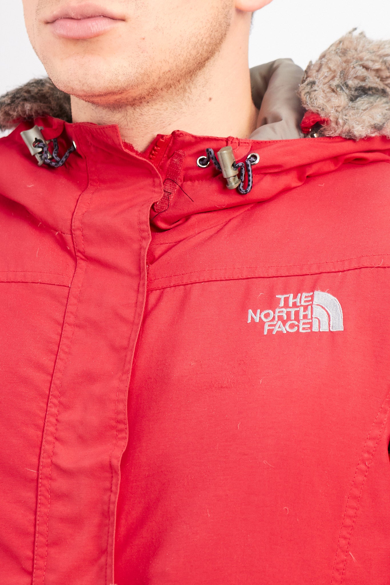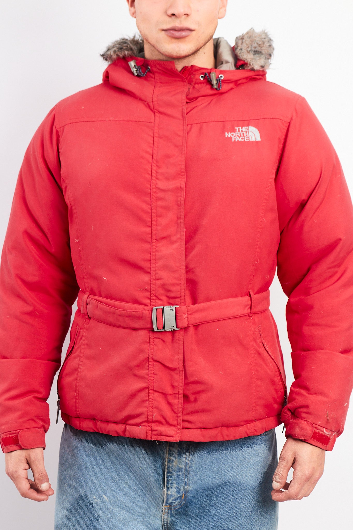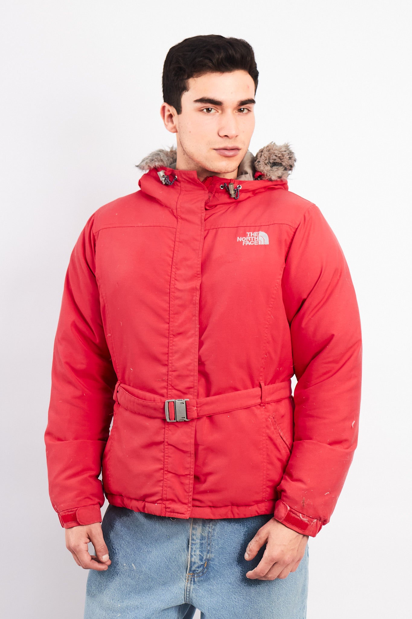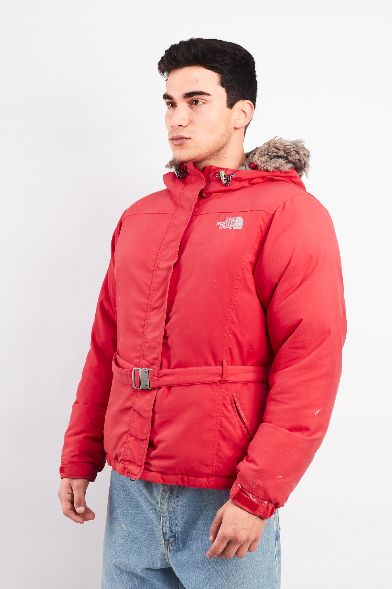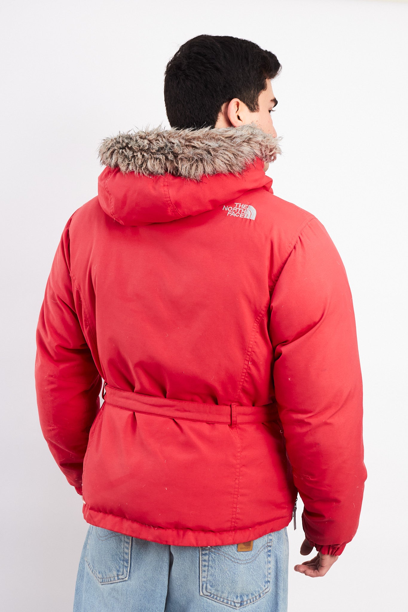 Hecho de 100% nylon con relleno de 100% plumas de ganso. Son las plumas de mayor calidad y mejor aislamiento. Color rojo con bordado North Face adelante y la espalda. Cuenta con un cinturón regulador en la parte central.