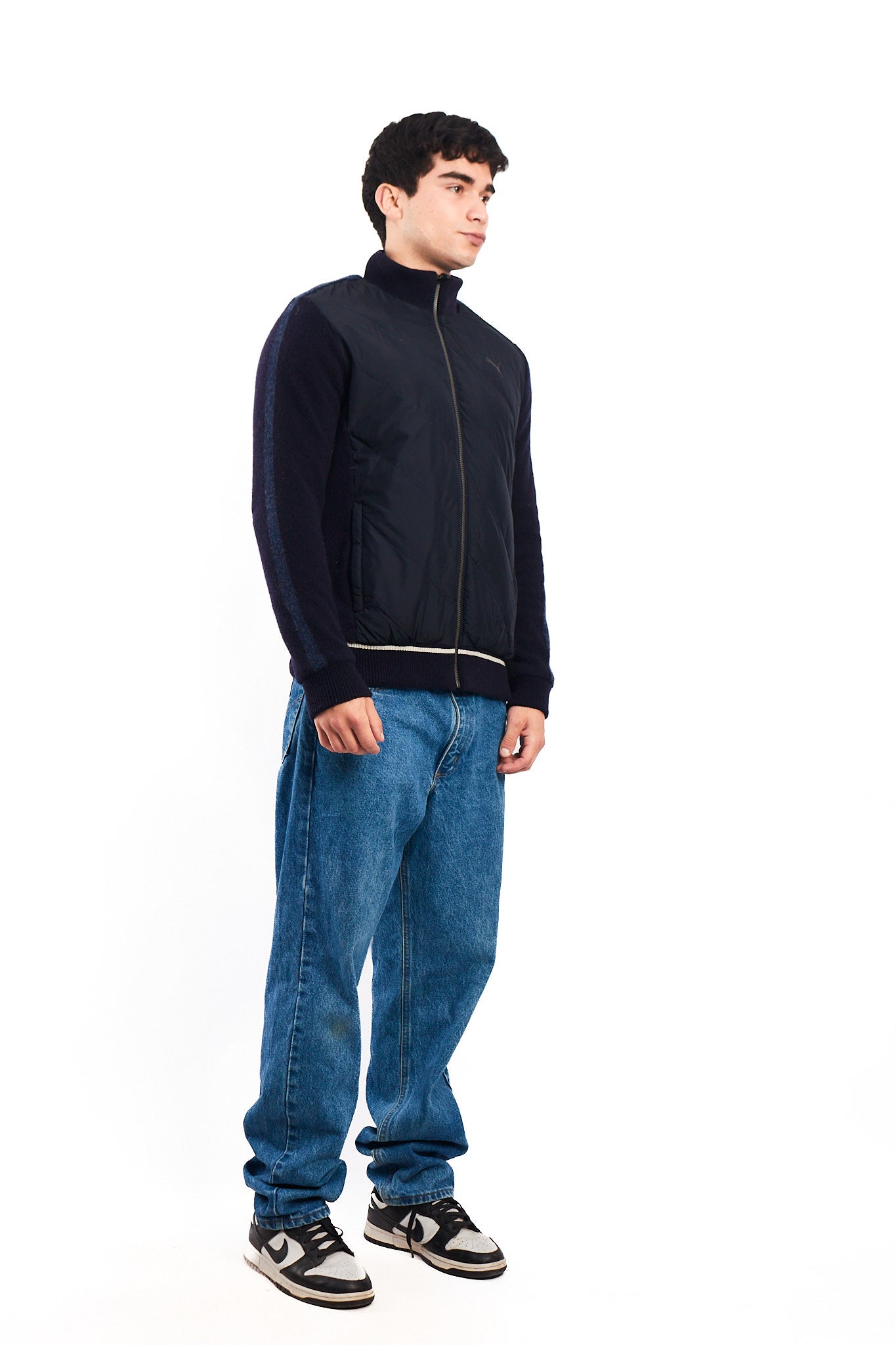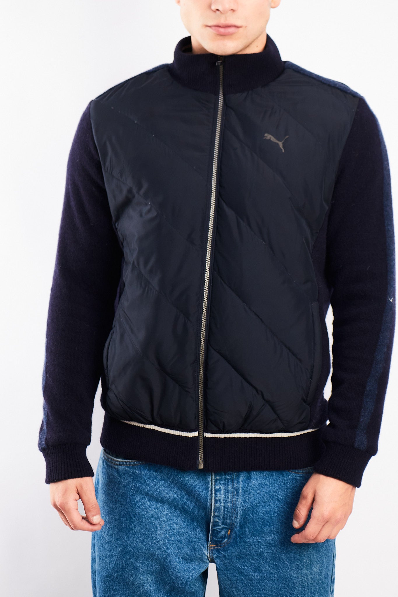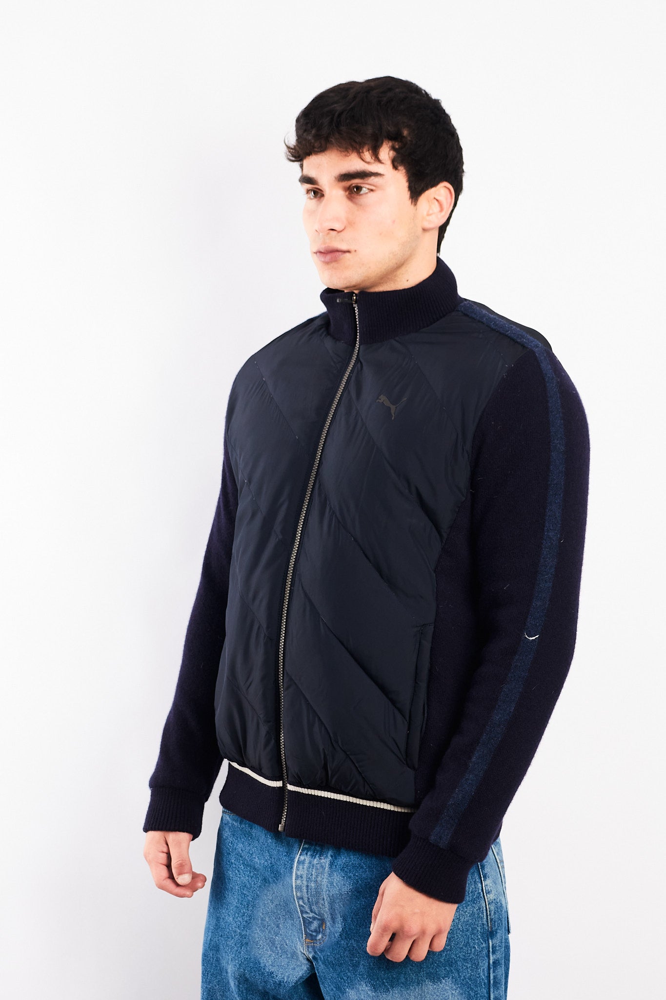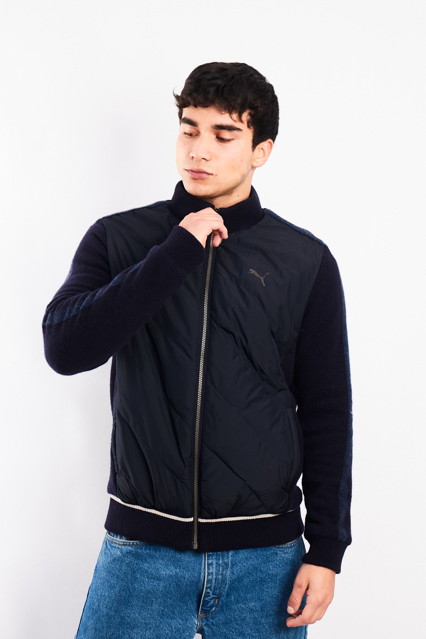 Hecho de 100% polyester y lana. Color negro con azul. Tiene un estampado Puma en el pecho Cuenta con 2 bolsillo externos.