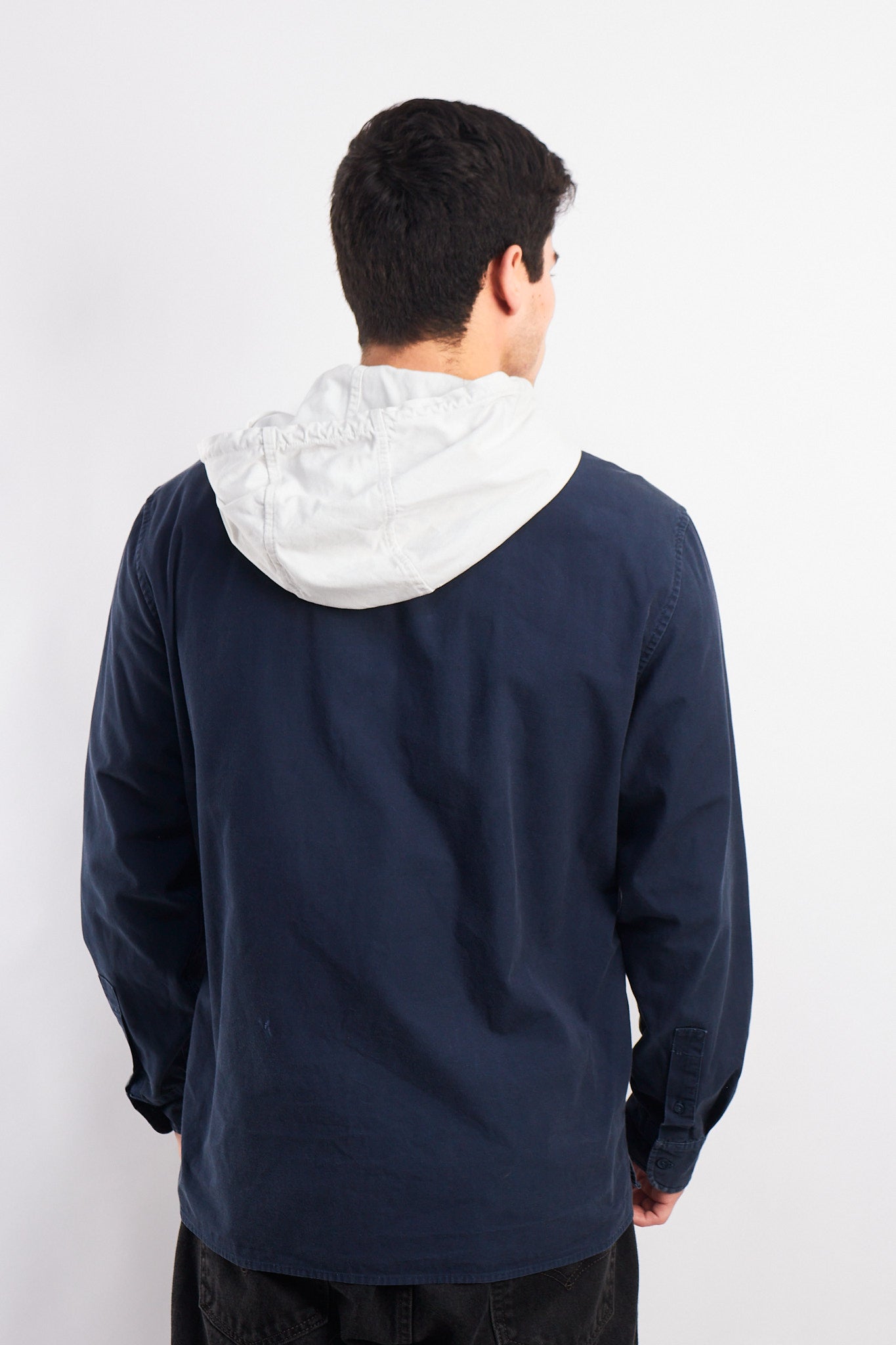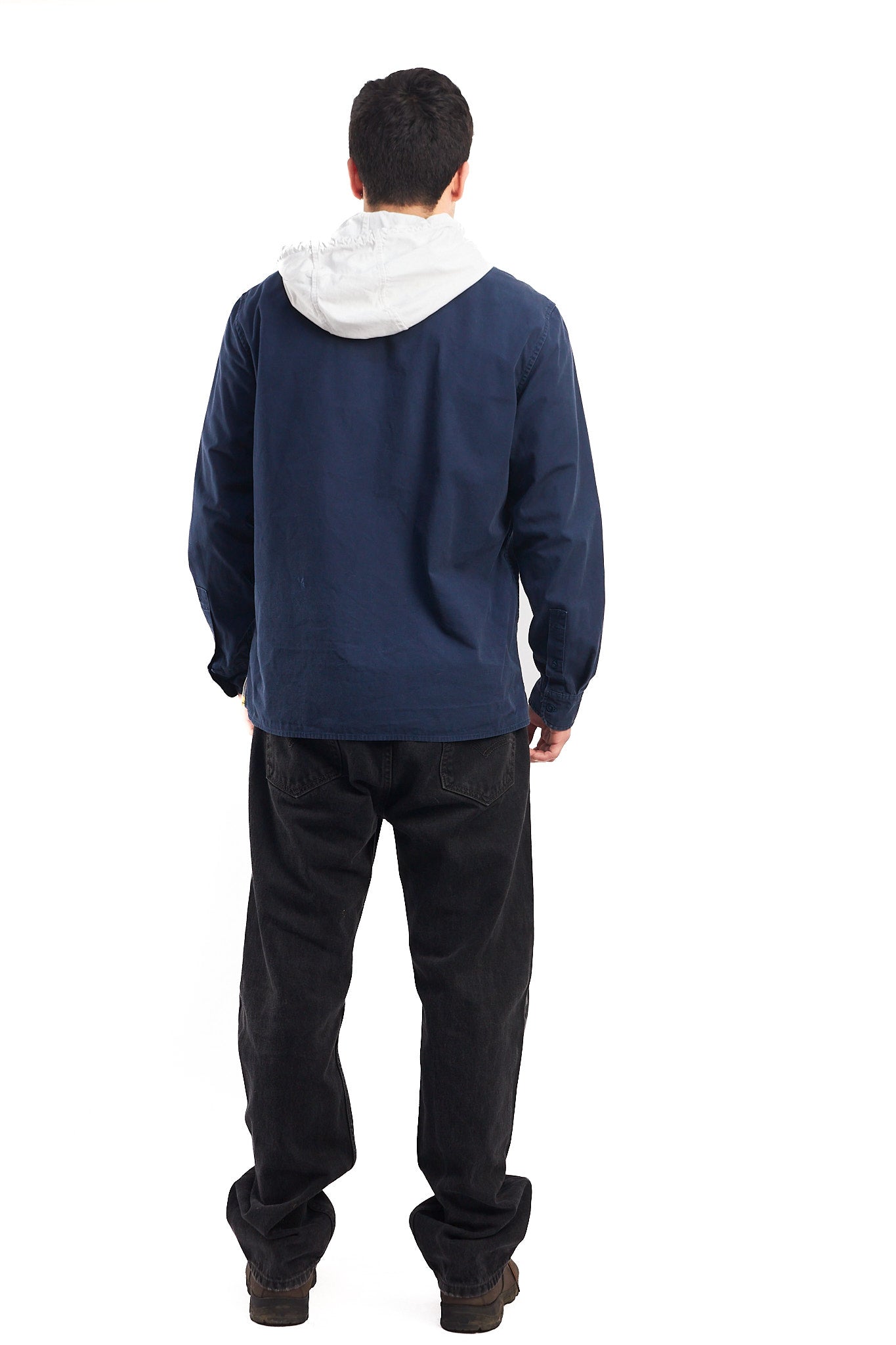 Hecho de 100% algodón. Color azul marino con banderas nauticas rojiblancas y amarillas-blancas. Tiene bordado Tommy en el pecho. Cuenta con capucha y botones para ajustar en las mangas.
