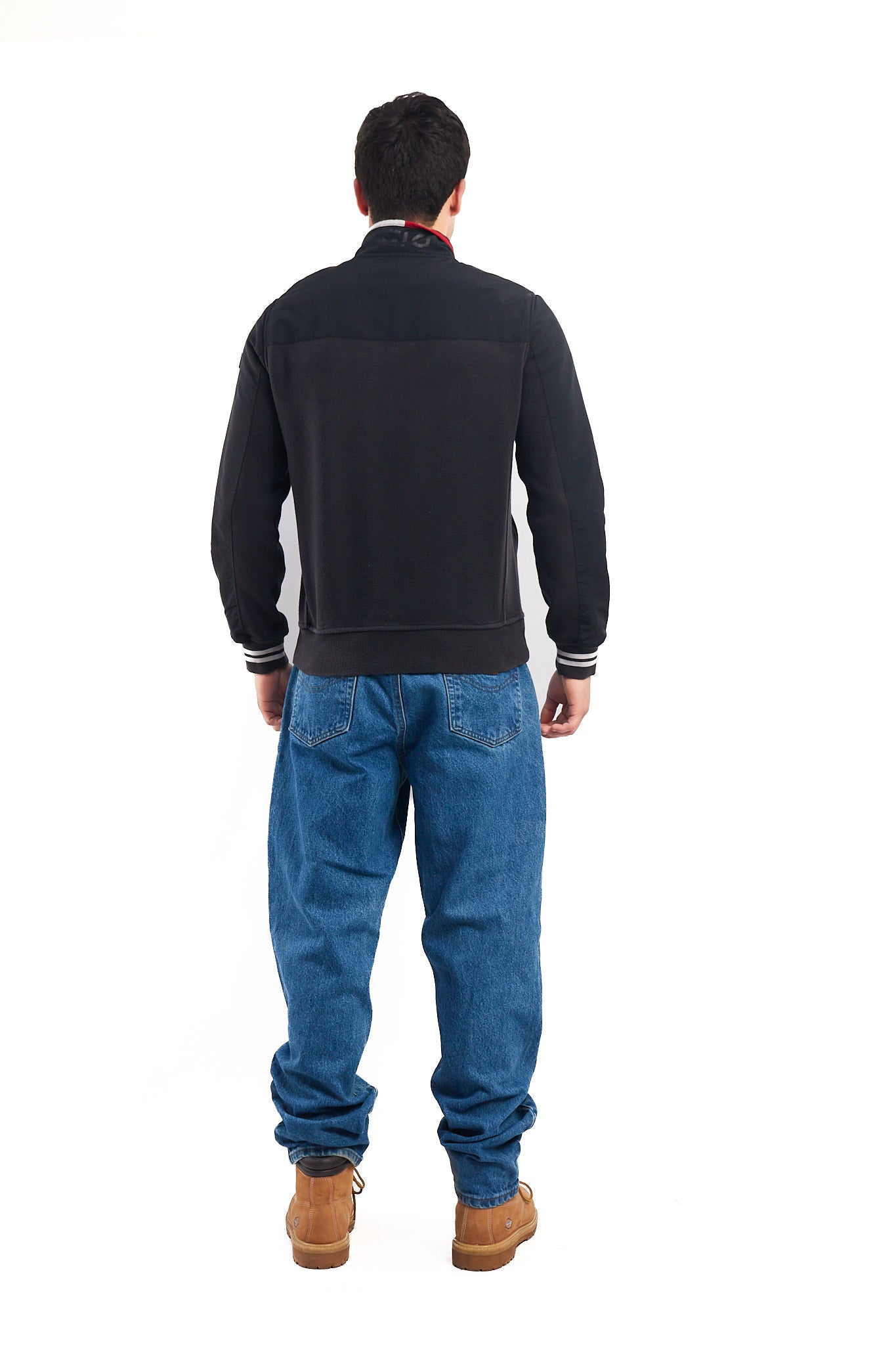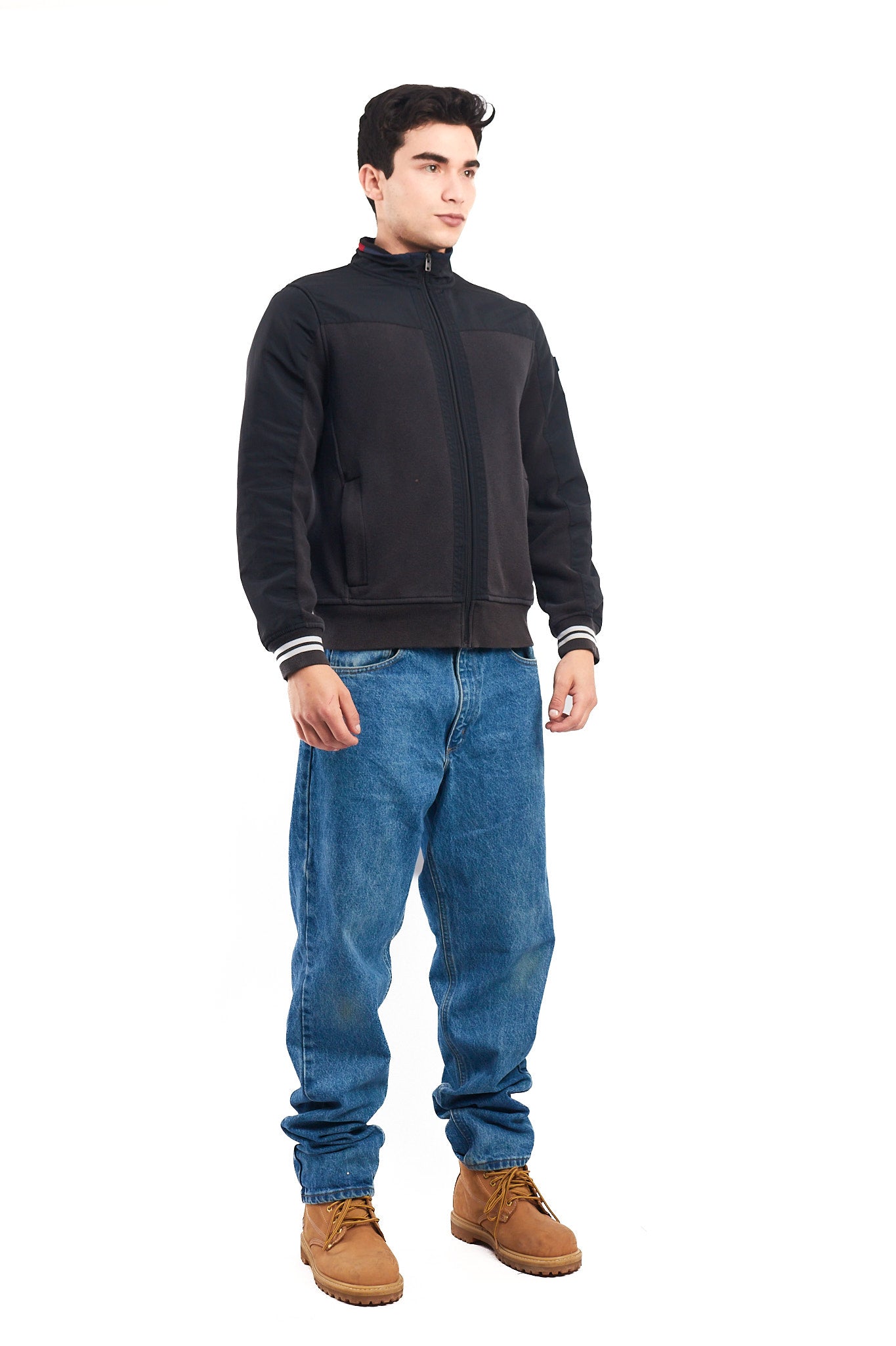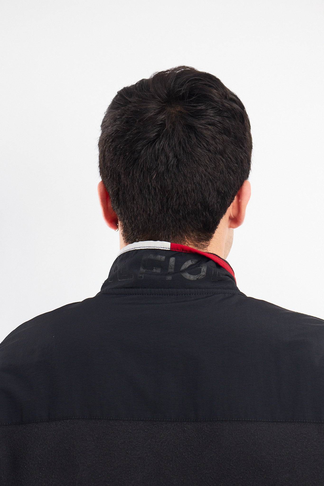 Hecho de 100% polyester. Color negro con 2 texturas diferentes algodón y polyester. Cuenta con parche plastificado Tommy en en el brazo y cuello tiene la bandera con un estampado . Cuenta con 2 bolsillos a los lados.