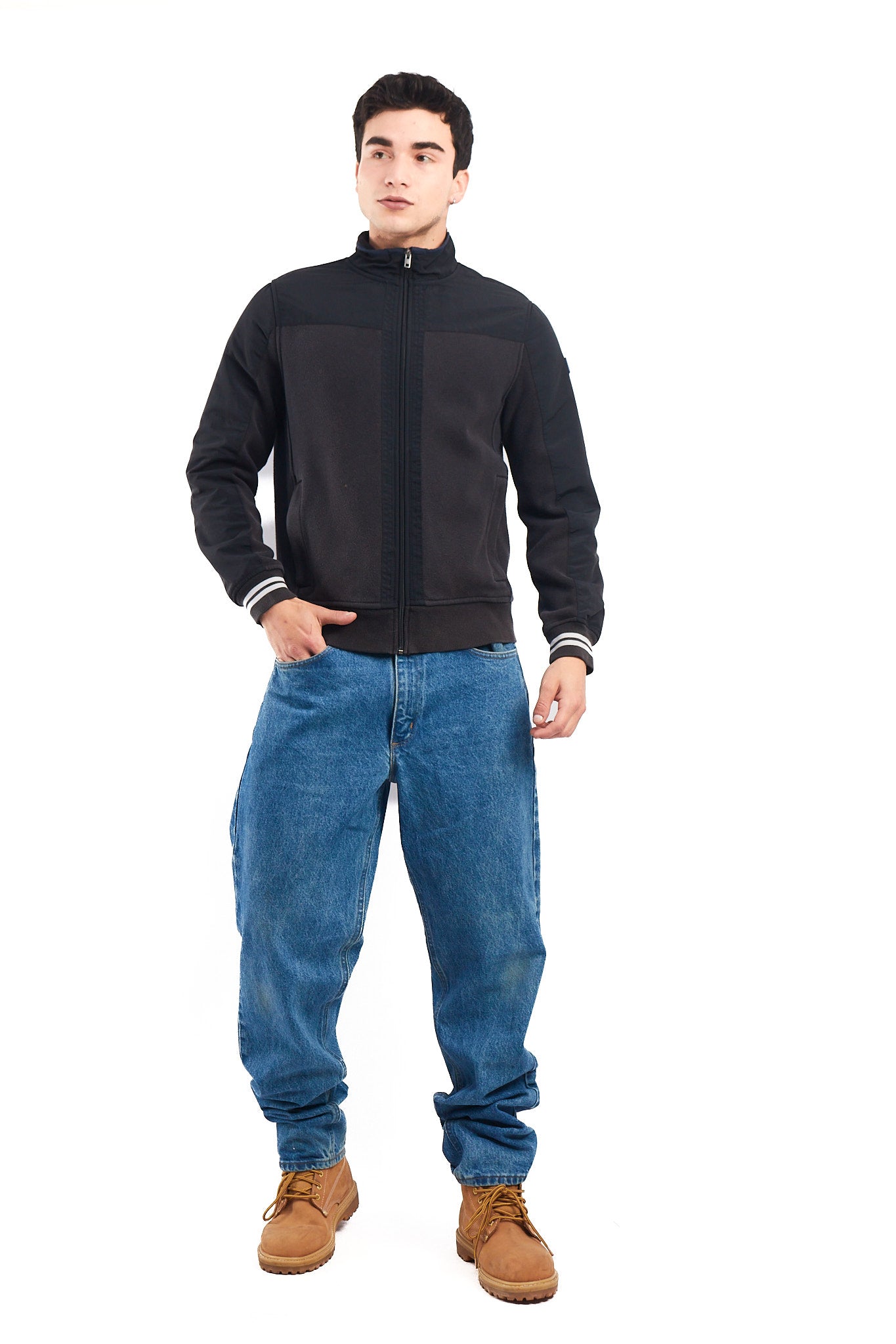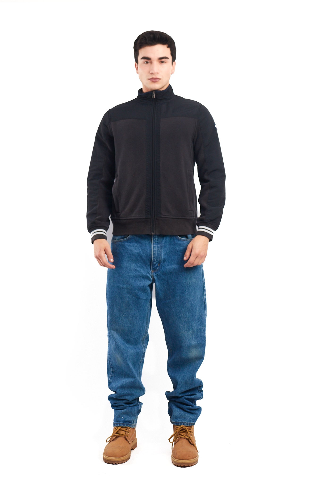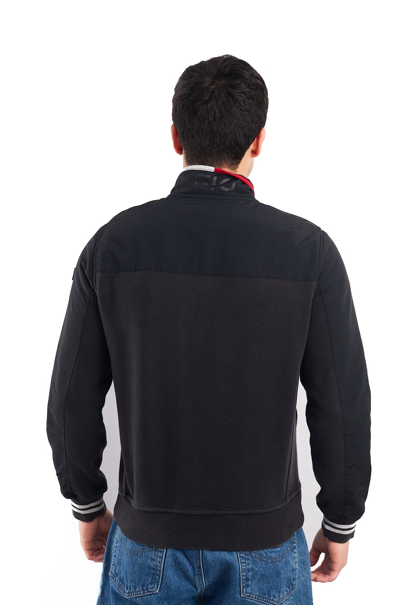 Hecho de 100% polyester. Color negro con 2 texturas diferentes algodón y polyester. Cuenta con parche plastificado Tommy en en el brazo y cuello tiene la bandera con un estampado . Cuenta con 2 bolsillos a los lados.
