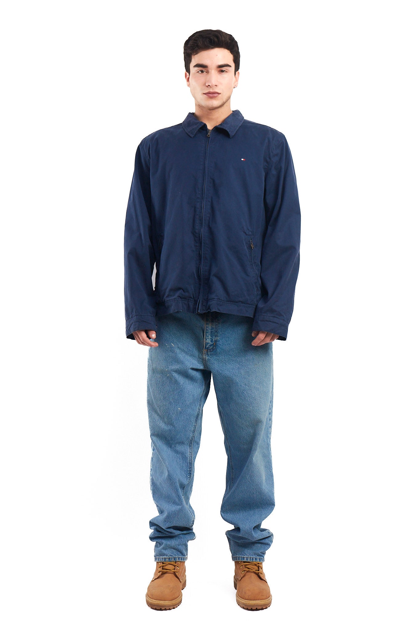 Hecho de 100% algodón. Color azul marino. Cuenta con bordado Tommy en el pecho. Cuenta con 2 bolsillos a los lados. Forro interno de cuadros rojo y azul con 2 bolsillos internos.