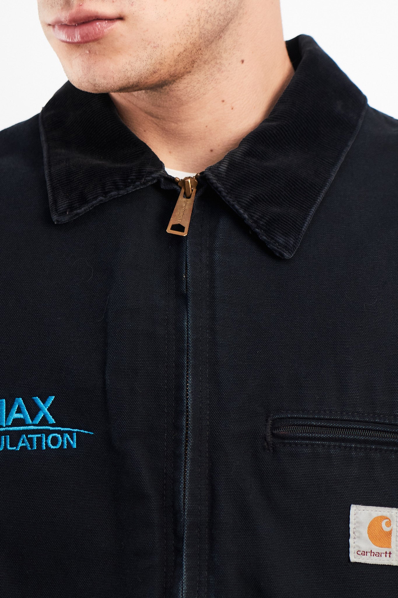 Hecho de 100% algodón grueso y ligeramente pesado(lona). Color black o negro con cuello corduroy negro. Cuenta con tag Carhartt en el pecho. El fit es ceñido y corte boxy. Cuenta con 3 bolsillos con cierre y dos bolsillos interiores. Forro interno blanket line color gris con franjas rojas y azules. Cuenta con broches Carhartt en mangas y cintura.